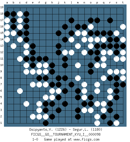 Last move : 1-0 2021 October 19 1:6:58 [Event "FICGS__GO__TOURNAMENT_KYU_I__000098"] [Site "FICGS"] [Date "2021.06.12"] [Round "1"] [Black "Osipyants,Vladimir"] [White "Segur,Laurine"] [Result "1-0"] [Rating 1 "1226"] [Rating 2 "1180"] 1.q15 d4 2.d16 q4 3.p17 c6 4.k4 n3 5.g3 e2 6.m3 p7 7.r3 q3 8.r4 r2 9.s2 r5 10.s5 r6 11.s6 r9 12.r13 c17 13.d17 c16 14.c15 b15 15.b14 c14 16.d15 b13 17.b16 a14 18.b17 c18 19.b18 a16 20.d18 a17 21.a18 a15 22.j15 n14 23.m16 l14 24.k10 e7 25.d11 c11 26.d14 d13 27.e13 d12 28.e12 d10 29.e11 d9 30.j13 p14 31.p12 n12 32.o10 l12 33.k11 m10 34.k8 m8 35.n4 o3 36.m2 g5 37.h4 j6 38.l7 n7 39.k6 h8 40.h10 f10 41.f11 g10 42.g11 g2 43.h2 f3 44.g1 f2 45.g4 f4 46.j5 h5 47.j7 h6 48.j3 s1 49.q2 p2 50.r1 p1 51.s7 s11 52.q13 s13 53.r14 s15 54.s14 t14 55.s12 t12 56.t13 t11 57.t15 r12 58.s13 q11 59.p11 q10 60.o9 o16 61.o17 l16 62.n16 n15 63.k16 m15 64.l17 n5 65.o4 p4 66.o5 p6 67.m5 n6 68.m6 p10 69.o12 q12 70.p13 o13 71.l15 q14 72.p15 o14 73.o15 m13 74.k14 k12 75.j12 t16 76.r15 t14 77.r17 t8 78.s8 s9 79.t7 t9 80.r8 q8 81.h9 g9 82.e10 e9 83.g8 f9 84.h7 g7 85.f8 f7 86.j8 1-0 Here are the names of the openings (joseki) played in the four corners : Corner d16 : d16 c17 Hoshi (Hwajeom, Seongjeom, Xingwei`) 4-4 Point. The star or hoshi (4-4) point, emphasizing influence at the potential expense of territory. Player Black won this Go (weiqi, baduk) game. Follow this game move after move (download)The monkey jump is worth eight points. (Anonymous) Creativity is allowing yourself to make mistakes. Art is knowing which ones to keep. (Scott Adams)