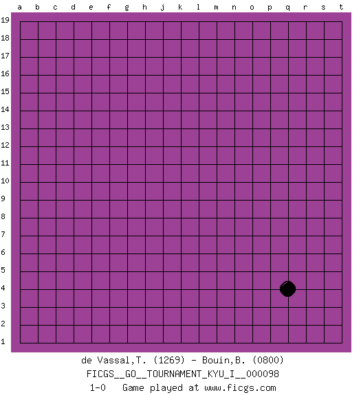 Last move : 1-0 2021 July 13 0:32:17 [Event "FICGS__GO__TOURNAMENT_KYU_I__000098"] [Site "FICGS"] [Date "2021.06.12"] [Round "1"] [Black "de Vassal,Thibault"] [White "Bouin,Bernard"] [Result "1-0"] [Rating 1 "1269"] [Rating 2 "0800"] 1.q4 1-0 This go game has been lost on time (started : 2021.06.12 16:54:8) Here are the names of the openings (joseki) played in the four corners : Corner q4 : q4 1-0 Hoshi (Hwajeom, Seongjeom, Xingwei`) 4-4 Point. The star or hoshi (4-4) point, emphasizing influence at the potential expense of territory. Player Black won this Go (weiqi, baduk) game. Follow this game move after move (download)A basic: Don't push too hard. (Jansteen) Think like a man of action, act like a man of thought. (Henri Louis Bergson)
