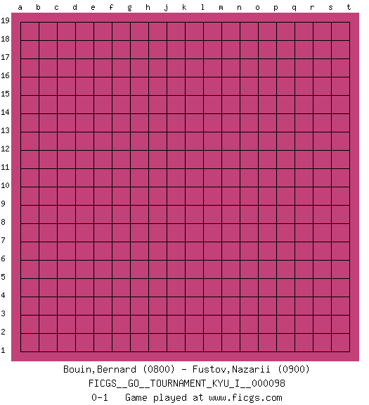 Last move : 0-1 2021 July 13 0:32:17 [Event "FICGS__GO__TOURNAMENT_KYU_I__000098"] [Site "FICGS"] [Date "2021.06.12"] [Round "1"] [Black "Bouin,Bernard"] [White "Fustov,Nazarii"] [Result "0-1"] [Rating 1 "0800"] [Rating 2 "0900"] 0-1 This go game has been lost on time (started : 2021.06.12 16:54:8) Here are the names of the openings (joseki) played in the four corners : Player White won this Go (weiqi, baduk) game. Follow this game move after move (download)The saki bottle shape is negative. (Anonymous) As a goal marker shodan is important. As a destination it is a poor place to stop. (Thomas Tamayo)