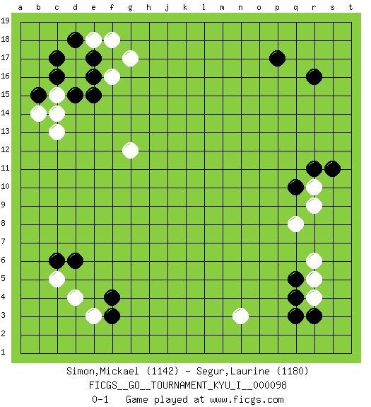 Last move : 0-1 2021 August 31 3:54:34 [Event "FICGS__GO__TOURNAMENT_KYU_I__000098"] [Site "FICGS"] [Date "2021.06.12"] [Round "1"] [Black "Simon,Mickael"] [White "Segur,Laurine"] [Result "0-1"] [Rating 1 "1142"] [Rating 2 "1180"] 1.r16 d4 2.q3 d16 3.p17 c13 4.q10 g17 5.f3 r4 6.r3 r6 7.q4 q8 8.q5 r5 9.c17 d17 10.c16 c15 11.b15 b14 12.d15 c14 13.d18 g12 14.e15 e18 15.e17 f16 16.e16 f18 17.d6 c5 18.c6 e3 19.f4 r10 20.r11 r9 21.s11 n3 0-1 This go game has been lost on time (started : 2021.06.12 16:54:8) Here are the names of the openings (joseki) played in the four corners : Corner d4 : d4 f3 Hoshi (Hwajeom, Seongjeom, Xingwei`) 4-4 Point. The star or hoshi (4-4) point, emphasizing influence at the potential expense of territory. Ikken Kakari (Hankan Keolch'im, Yi Gua`jiao~, 1-Space Low Approach). Black 2 is the standard approach move to the 4-4. Corner q4 : q3 r4 Komoku (Somok, Xiao~mu`) 3-4 Point. The komoku (3-4) point is the traditional corner enclosure move.. Player White won this Go (weiqi, baduk) game. Follow this game move after move (download)The poor player plays the opponent's game for him. (Anonymous) Fortune favours the audacious. (Desiderius Erasmus)