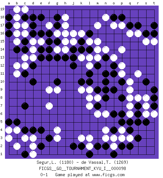 Last move : 0-1 2022 March 4 1:13:5 [Event "FICGS__GO__TOURNAMENT_KYU_I__000098"] [Site "FICGS"] [Date "2021.06.12"] [Round "1"] [Black "Segur,Laurine"] [White "de Vassal,Thibault"] [Result "0-1"] [Rating 1 "1180"] [Rating 2 "1269"] 1.d4 q16 2.q4 c16 3.r17 r16 4.q17 p17 5.p18 o17 6.o18 n18 7.s16 s15 8.t17 m17 9.d17 c17 10.d16 d15 11.c18 b18 12.e18 h17 13.f16 h15 14.c7 q9 15.r7 r8 16.d10 e15 17.g15 g16 18.f15 f17 19.e16 c12 20.f13 k9 21.j12 l13 22.k10 m10 23.o9 q7 24.r6 q6 25.q5 n6 26.n8 l7 27.m9 l9 28.n10 m8 29.n9 m11 30.o12 p11 31.m7 l8 32.p10 q10 33.o11 m6 34.p8 p12 35.m12 l12 36.n11 m13 37.n13 p14 38.o6 q8 39.p6 n4 40.o4 g4 41.f3 g3 42.c11 b12 43.l10 f7 44.g10 g9 45.n2 n3 46.m2 o3 47.p2 o2 48.o1 p3 49.q2 q3 50.r3 p4 51.p5 l3 52.k2 l2 53.l1 k3 54.j2 n14 55.d12 d13 56.e13 b11 57.e14 d14 58.s10 r11 59.t8 s7 60.s5 s8 61.t7 t6 62.t9 s6 63.r5 t15 64.t16 f9 65.j14 h14 66.h13 j15 67.k14 l15 68.k15 g14 69.f14 k16 70.l14 m14 71.g13 k13 72.j13 j16 73.l16 m15 74.l11 o13 75.g18 h18 76.g17 h16 77.c15 b15 78.c14 c13 79.b14 b16 80.a18 b19 81.a17 c19 82.d18 b17 83.a16 c3 84.c4 d2 85.e2 b2 86.b3 d3 87.e4 b4 88.b5 a3 89.c1 d1 90.a5 a4 0-1 Here are the names of the openings (joseki) played in the four corners : Corner q16 : q16 r17 Hoshi (Hwajeom, Seongjeom, Xingwei`) 4-4 Point. The star or hoshi (4-4) point, emphasizing influence at the potential expense of territory. Corner d16 : c16 d17 Komoku (Somok, Xiao~mu`) 3-4 Point. The komoku (3-4) point is the traditional corner enclosure move.. Corner q4 : q4 q9 Hoshi (Hwajeom, Seongjeom, Xingwei`) 4-4 Point. The star or hoshi (4-4) point, emphasizing influence at the potential expense of territory. Player White won this Go (weiqi, baduk) game. Follow this game move after move (download)Keep inessential ataris till the end. (Anonymous) You have to believe in yourself. (Sun Tzu)