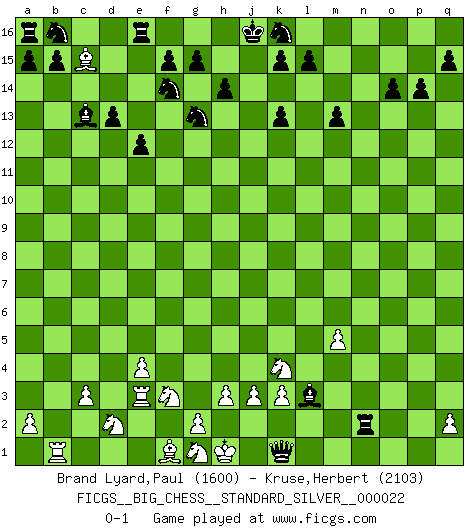 Last move : 0-1 2021 June 17 11:11:16 [Event "FICGS__BIG_CHESS__STANDARD_SILVER__000022"] [Site "FICGS"] [Date "2021.06.12"] [Round "2"] [White "Brand Lyard,Paul"] [Black "Kruse,Herbert"] [Result "0-1"] [WhiteElo "1600"] [BlackElo "2103"] 1.j2-k4 m15-m13 2.n2-n3 j15-k13 3.h1-o7 h15-g13 4.d2-d4 p16-o14 5.c1-p13 e15-e13 6.e2-e4 h16-m12 7.p13-o14 n15-o14 8.o1-d11 e13-e12 9.d11-c10 m12-d4 10.c2-c3 d4-f2 11.h2-f3 f2-b2 12.b1-d2 b2-b8 13.j1-h1 d15-d13 14.a1-b1 b8-d6 15.c10-b11 c16-n6 16.o7-n6 d6-n6 17.k2-k3 g16-f14 18.b11-j4 f16-c13 19.l1-k2 o16-g9 20.m2-m4 l16-o13 21.m4-m5 n6-p4 22.p1-q3 p4-p2 23.q1-p1 p2-q3 24.p1-q1 q16-n16 25.j4-p10 n16-n10 26.p10-o9 n10-o10 27.o9-k13 j14-k13 28.k2-n5 o10-o2 29.m1-p1 g9-n3 30.p1-p15 o13-p14 31.p15-p14 o15-p14 32.e1-e3 o2-o1 33.q1-o1 q3-o1 34.h1-j1 m16-n16 35.n5-c15 n3-m4 36.j1-j2 o1-l1 37.l2-l3 n16-n2 38.j2-j1 m4-l3 39.j1-h1 l1-k1 0-1 Follow this game move after move (download)For surely of all the drugs in the world, Chess must be the most permanently pleasurable. (Assiac) Schach wird sich dank seiner hohen kulturellen Tradition immer durchsetzen. In näherer Zukunft womöglich sogar als Gegenreaktion auf die maßlose Reizüberflutung im Freizeit- und Spielbereich. (Garry Kasparov) El Ajedrez es como la guerra en un tablero. (Bobby Fischer) Mais n'est-ce pas déjà le limiter injurieusement que d'appeler les échecs un jeu? N'est-ce pas aussi une science, un art, ou quelque chose qui, comme le cercueil de Mahomet entre ciel et terre, est suspendu entre l'un et l'autre, et qui réunit un nombre incroyable de contraires ? (Stefan Zweig) To err is human, to shift the blame on someone else is tactical. (Mladen Jankovic)