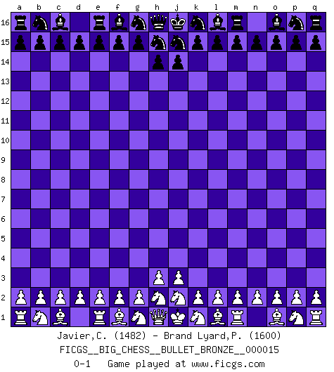 Last move : 0-1 2021 June 13 9:58:43 [Event "FICGS__BIG_CHESS__BULLET_BRONZE__000015"] [Site "FICGS"] [Date "2021.06.12"] [Round "1"] [White "Javier,Christian"] [Black "Brand Lyard,Paul"] [Result "0-1"] [WhiteElo "1482"] [BlackElo "1600"] 0-1 This big chess game has been lost on time (started : 2021.06.12 21:32:20) Follow this game move after move (download)He who fears an isolated Queen's Pawn should give up Chess. (Siegbert Tarrasch) Es tut gut, die Entwicklungsperiode von, [...] demokratischem Geist durchdringen zu lassen. Wie undemokratisch wäre es doch beispielsweise, den einen Offizier große Spaziertouren vornehmen zu lassen, während die anderen zu Hause säßen und sich entsetzlich langweilten. (Aaron Nimzowitsch) Yo no creo en la psicología. Yo creo en las buenas movidas. (Bobby Fischer) Vous m'avez demandé de vous exposer quel est le fondement de la prière. Je ne fais que préparer les pièces du jeu sur la table... Nous sera-t-il permis d'en adopter les règles et si nous les appliquons scrupuleusement nous ne tarderons pas à faire mat le Roi divin ! Il ne pourra échapper à nos mains. (Sainte Thérèse d'Avila, Chemin de perfection) My poor ole parrot... Is not in the circulation of displays ....poo hoo hoo :) (Wayne Lowrance's enigma)