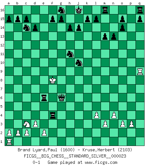 Last move : 0-1 2021 June 18 21:23:35 [Event "FICGS__BIG_CHESS__STANDARD_SILVER__000023"] [Site "FICGS"] [Date "2021.06.13"] [Round "2"] [White "Brand Lyard,Paul"] [Black "Kruse,Herbert"] [Result "0-1"] [WhiteElo "1600"] [BlackElo "2103"] 1.j2-k4 m15-m13 2.m2-m3 j15-k13 3.h2-g4 e15-e13 4.l1-o4 h15-g13 5.o4-e13 e16-e13 6.h1-l4 b16-c14 7.d2-d3 f16-b12 8.c1-o12 k16-l14 9.l4-l10 n15-n13 10.o12-m10 d15-d14 11.m10-p13 p16-o14 12.p13-o14 p15-o14 13.p2-p3 l14-k12 14.l10-k11 c16-j10 15.k11-k10 g13-h11 16.k10-h8 b12-c13 17.h8-h10 c13-g9 18.o2-o3 g9-h10 19.g2-g3 l16-p12 20.h3-h4 p12-g4 21.k1-l3 h16-q8 22.n2-n4 h10-n5 23.f2-f3 n5-l3 24.k2-l3 q8-l3 25.j1-h2 l3-k2 26.h2-h1 j10-n6 27.l2-l4 g4-b9 28.g3-g4 k2-k3 29.h1-h2 k3-m1 30.o1-q3 n6-q3 31.p1-q3 m1-q1 32.f1-o9 q1-q2 33.h2-h3 q2-q3 34.o9-k13 e13-k13 35.g1-j2 k12-j10 36.b1-c3 o16-f8 37.e1-q1 q3-m7 38.j3-j4 f8-k4 39.j2-k4 k13-k4 40.q1-q9 m7-j4 41.h3-g3 j4-h4 42.g3-f4 b9-g4 43.f3-g4 h4-g4 44.f4-e5 a16-e16 45.e5-f6 e16-e6 46.f6-f7 g4-g6 47.f7-f8 k4-f4 0-1 Follow this game move after move (download)First-class players lose to second class players because second-class players sometimes play a first-class game. (Tarrasch) Die FIDE ist dabei in die Hände der russischen Mafia zu fallen. (Larry Evans) No es tiempo de jugar al Ajedrez cuando la casa esta en llamas. (Proverbio Italiano) Les ravages du H expliquent la différence de niveau entre Tal et Thal [Abergel]. Art is not a thing, it is a way. (Elbert Hubbard)