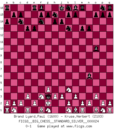 Last move : 0-1 2021 June 17 1:24:36 [Event "FICGS__BIG_CHESS__STANDARD_SILVER__000024"] [Site "FICGS"] [Date "2021.06.13"] [Round "1"] [White "Brand Lyard,Paul"] [Black "Kruse,Herbert"] [Result "0-1"] [WhiteElo "1600"] [BlackElo "2103"] 1.j2-k4 m15-m13 2.d2-d3 j15-k13 3.c1-l9 h16-o10 4.o2-o3 o10-f2 5.h2-f3 f2-a7 6.h1-m5 a7-a9 7.j1-h1 a9-l9 8.m5-e12 g16-f14 9.e12-e13 b16-c14 10.e13-b13 a15-a14 11.b13-c13 e15-e13 12.c13-c12 d15-d13 13.c12-k12 n15-n13 14.k12-q12 o16-n15 15.q12-q8 n15-l13 16.g2-g4 l13-q8 17.l2-l3 c16-n6 18.h1-h2 l9-f4 19.h2-g2 q8-o10 20.e1-d1 f4-g3 0-1 Follow this game move after move (download)With or without the title, Bobby Fischer was unquestionably the greatest player of his time. (Burt Hochberg) Offener Brief an US-Präsident Bush anlässlich der Verhaftung Bobby Fishers: Verhaften Sie mich. Stecken Sie mich in dieselbe Zelle wie Bobby Fisher und geben Sie uns ein Schachspiel mit. (Boris Vassilievich Spassky) Morphy probablemente fue el genio más grande de todos. (Bobby Fischer) Pour se monter efficace, un Cavalier a besoin d'avant-postes ! Les Cavaliers font les meilleurs bloqueurs de pions passés. It's not enough to succeed. Others must fail. (Gore Vidal)