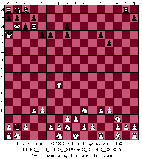 Last move : 1-0 2021 June 20 23:55:45 [Event "FICGS__BIG_CHESS__STANDARD_SILVER__000026"] [Site "FICGS"] [Date "2021.06.13"] [Round "2"] [White "Kruse,Herbert"] [Black "Brand Lyard,Paul"] [Result "1-0"] [WhiteElo "2103"] [BlackElo "1600"] 1.j2-k4 f15-f14 2.h1-o7 j15-h13 3.o7-o15 p16-o14 4.o15-c4 c15-c14 5.h2-g4 n15-n14 6.m2-m4 o16-d6 7.k1-h2 d6-h2 8.g4-h2 m15-m13 9.p1-o3 n14-n13 10.l1-p5 l16-p12 11.e2-e4 p12-k7 12.c4-c7 k15-k14 13.c7-k7 m16-m14 14.f1-b5 n13-n12 15.d2-d4 e15-e13 16.c1-o12 m14-l14 17.b5-l14 j16-j15 18.l14-j12 f16-d14 19.o12-l15 k14-k13 20.j12-h13 j14-h13 21.k7-k13 k16-j14 22.p5-k10 j14-l15 23.k10-m12 h15-k14 24.k13-k14 j15-h15 25.k14-l15 g16-j15 26.l15-p15 q16-p16 27.p15-o14 h16-o16 28.o14-k14 e16-l16 29.k14-j15 h15-g14 30.e1-e3 o16-b4 31.e3-g3 g14-f15 32.g3-g15 f15-e14 33.j15-j10 f14-f13 34.g15-g14 e14-d13 35.j10-d10 d13-c13 36.m12-h8 c13-b13 37.n2-n4 b13-a12 38.g14-d14 l16-l11 39.h8-l11 b4-b2 40.d10-a10 a12-b12 41.l11-g7 b12-c13 42.a10-a11 c13-b14 43.a11-a13 1-0 Follow this game move after move (download)The most important feature of the Chess position is the activity of the pieces. This is absolutely fundamental in all phases of the game: Opening, Middlegame and especially Endgame. The primary constraint on a piece's activity is the Pawn structure. (Michael Stean) Der vorletzte Fehler gewinnt. (Savielly Grigorievitsch Tartakower) Haz el enroque temprano y seguido. (Rob Sillars) Dans le domaine de la peinture, de la gravure et de la sculpture, dès la première décennie de notre siècle, les artistes abandonnent la représentation de la partie d'échecs pour se concentrer sur les pièces, sur les échiquiers et sur toutes les variations auxquelles les unes et les autres peuvent donner lieu. On passe en quelque sorte d'un thème social à un thème musical (au sens de la musica médiévale, c'est-à-dire d'une notion qui inclue le rythme, l'harmonie, la construction et la déconstruction, etc.). Graphiquement et picturalement, l'échiquier apparaît comme une structure ouverte, dynamique, d'une richesse infinie, autorisant toutes les combinatoires et débouchant sur des mouvements et des rythmes de nature exponentielle. (Michel Pastoureau) Without deviation from the norm, progress is not possible. (Frank Zappa)