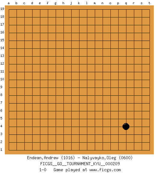 Last move : 1-0 2021 July 15 2:14:56 [Event "FICGS__GO__TOURNAMENT_KYU__000209"] [Site "FICGS"] [Date "2021.06.14"] [Round "1"] [Black "Endean,Andrew"] [White "Nalyvayko,Oleg"] [Result "1-0"] [Rating 1 "1016"] [Rating 2 "0600"] 1.q4 1-0 This go game has been lost on time (started : 2021.06.14 11:29:38) Here are the names of the openings (joseki) played in the four corners : Corner q4 : q4 1-0 Hoshi (Hwajeom, Seongjeom, Xingwei`) 4-4 Point. The star or hoshi (4-4) point, emphasizing influence at the potential expense of territory. Player Black won this Go (weiqi, baduk) game. Follow this game move after move (download)In opponents' sphere of influence, avoid sharp conflict, don't move too deep. (Otake Hideo, 9p) Hello Thibault, if I have had a plan (and I had one, I hope), I have forgotten it during the last week... - Hello Heinz-Georg. What do you mean a plan ? (Anonymous players, during a Big Chess game)
