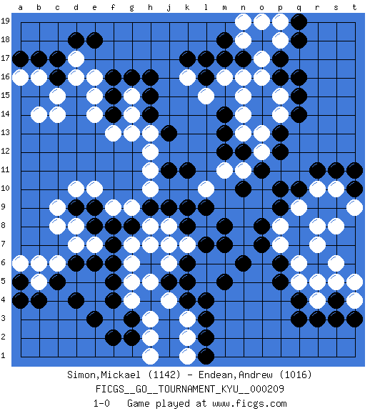 Last move : 1-0 2021 September 26 20:55:2 [Event "FICGS__GO__TOURNAMENT_KYU__000209"] [Site "FICGS"] [Date "2021.06.14"] [Round "1"] [Black "Simon,Mickael"] [White "Endean,Andrew"] [Result "1-0"] [Rating 1 "1142"] [Rating 2 "1016"] 1.q16 d16 2.q3 q5 3.d4 c6 4.f16 c14 5.k17 d10 6.q10 r7 7.p5 q6 8.p6 p7 9.o7 p8 10.o8 q9 11.p9 r8 12.p10 r10 13.r11 s10 14.s11 f3 15.f4 g4 16.f5 g5 17.d6 d7 18.f6 g6 19.f7 g7 20.g8 h8 21.f8 g9 22.h9 j8 23.g3 h3 24.g2 h2 25.f2 h10 26.j9 f9 27.k8 k7 28.k9 l7 29.e9 e10 30.d9 c9 31.e8 c8 32.j5 j4 33.k5 h5 34.k4 k3 35.l3 k2 36.l2 j6 37.k6 o17 38.p17 o16 39.m17 p14 40.q14 p15 41.q15 n15 42.p13 o13 43.p12 o12 44.o11 n11 45.n10 m11 46.c17 d17 47.c16 c15 48.d18 e15 49.m13 n14 50.n12 n13 51.m12 l10 52.k11 h11 53.j11 h12 54.j13 h13 55.f15 e14 56.f14 f13 57.h14 g14 58.h15 g15 59.g16 g13 60.c5 b6 61.e18 e16 62.t10 t9 63.t11 s8 64.s4 r4 65.r3 s5 66.s3 s6 67.q4 r5 68.h16 b16 69.b17 a16 70.a17 b14 71.m7 l8 72.l9 p18 73.q18 p19 74.q19 n18 75.n17 n19 76.p16 n16 77.o18 o19 78.m18 m16 79.l16 l15 80.m14 k16 81.l17 d8 82.m8 l6 83.m5 l5 84.l4 m6 85.j7 h7 86.n6 b5 87.j7 k7 88.l7 j7 89.b4 e7 90.e6 h1 91.e3 k1 92.l1 t4 93.t3 t5 94.a5 a6 95.a4 1-0 Here are the names of the openings (joseki) played in the four corners : Corner q4 : q3 q5 Komoku (Somok, Xiao~mu`) 3-4 Point. The komoku (3-4) point is the traditional corner enclosure move.. Ikken Takagakari (Hankan Nop'dakeolch'im, Yi Gaogua`jiao~, 1-Space High Approach). The 5-4 approach move has become more popular in modern times, as modern Go emphasizes speed and influence. Corner d4 : d4 c6 Hoshi (Hwajeom, Seongjeom, Xingwei`) 4-4 Point. The star or hoshi (4-4) point, emphasizing influence at the potential expense of territory. Ikken Kakari (Hankan Keolch'im, Yi Gua`jiao~, 1-Space Low Approach). White 2 is the standard approach move to the 4-4. Corner d16 : d16 f16 Hoshi (Hwajeom, Seongjeom, Xingwei`) 4-4 Point. The star or hoshi (4-4) point, emphasizing influence at the potential expense of territory. Ikken Takagakari (Hankan Nop'dakeolch'im, Yi Gaojia, 1-Space High Approach). White typically responds at 6-4 or 3-10. White 4-10 is played when White finds play on the right side advantageous. White 4-8 or 3-8 may be played when White has support at top. Player Black won this Go (weiqi, baduk) game. Follow this game move after move (download)Each step in a ladder is worth 7 points. (Anonymous) The best teachers teach from the heart, not from the book. (Author unknown)