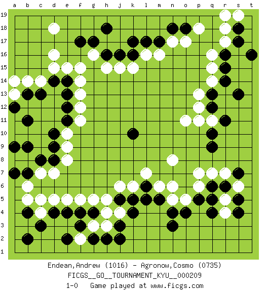 Last move : 1-0 2021 October 26 16:31:54 [Event "FICGS__GO__TOURNAMENT_KYU__000209"] [Site "FICGS"] [Date "2021.06.14"] [Round "1"] [Black "Endean,Andrew"] [White "Agronow,Cosmo"] [Result "1-0"] [Rating 1 "1016"] [Rating 2 "0735"] 1.q4 d16 2.d4 q16 3.q10 c7 4.f3 e8 5.k4 o11 6.r14 p13 7.q12 p12 8.q13 q14 9.r15 q15 10.r16 r17 11.s17 r18 12.s18 s19 13.t16 r19 14.s13 n8 15.f17 f15 16.h16 k15 17.k16 l16 18.k17 j15 19.j16 n5 20.n3 j6 21.l6 l7 22.m5 n6 23.n4 k6 24.k5 h4 25.j3 h3 26.j2 m6 27.l5 q7 28.r6 r7 29.q6 p6 30.p5 o5 31.o4 d18 32.l17 m16 33.m17 n17 34.n18 o17 35.o18 p18 36.d10 e10 37.e11 f11 38.e12 f12 39.e13 f13 40.e14 f14 41.d9 e9 42.d8 d7 43.c8 b8 44.b9 a8 45.a9 e15 46.d14 c14 47.c13 b14 48.b13 a13 49.a12 a14 50.b11 d15 51.b7 b6 52.a7 b5 53.b4 c4 54.c3 c5 55.b2 d5 56.e4 f5 57.g4 g5 58.h2 g3 59.f4 e5 60.g2 f2 61.e2 q11 62.r11 p11 63.q9 j4 64.j5 h5 65.k10 g16 66.g17 h15 67.h18 s6 68.s5 r5 69.q5 r4 70.s7 p7 71.s4 1-0 This go game has been lost on time (started : 2021.06.14 11:29:38) Here are the names of the openings (joseki) played in the four corners : Corner d4 : d4 c7 Hoshi (Hwajeom, Seongjeom, Xingwei`) 4-4 Point. The star or hoshi (4-4) point, emphasizing influence at the potential expense of territory. Niken Kakari (Dukan Keolch'im, E`r Gua`jiao~, 2-Space Low Approach). Black typically answers by 7-3 or 3-5 (which is not joseki). Corner q4 : q4 n8 Hoshi (Hwajeom, Seongjeom, Xingwei`) 4-4 Point. The star or hoshi (4-4) point, emphasizing influence at the potential expense of territory. Corner d16 : d16 f17 Hoshi (Hwajeom, Seongjeom, Xingwei`) 4-4 Point. The star or hoshi (4-4) point, emphasizing influence at the potential expense of territory. Ikken Kakari (Hankan Keolch'im, Yi Gua`jiao~, 1-Space Low Approach). Black 2 is the standard approach move to the 4-4. Player Black won this Go (weiqi, baduk) game. Follow this game move after move (download)Go uses the most elemental materials and concepts - line and circle, wood and stone, black and white - combining them with simple rules to generate subtle strategies and complex tactics that stagger the imagination. (Iwamoto Kaoru, 9 dan professional Go player and former Honinbo title holder) Man with more than one clock never knows what time it is. (Chinese thought)