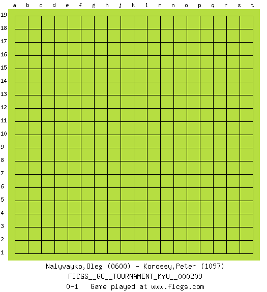 Last move : 0-1 2021 July 14 13:43:3 [Event "FICGS__GO__TOURNAMENT_KYU__000209"] [Site "FICGS"] [Date "2021.06.14"] [Round "1"] [Black "Nalyvayko,Oleg"] [White "Korossy,Peter"] [Result "0-1"] [Rating 1 "0600"] [Rating 2 "1097"] 0-1 This go game has been lost on time (started : 2021.06.14 11:29:38) Here are the names of the openings (joseki) played in the four corners : Player White won this Go (weiqi, baduk) game. Follow this game move after move (download)Very few good moves are played. (Pierre Audouard) Just because you do not take an interest in politics doesn't mean politics won't take an interest in you. (Pericles 430 B.C.)
