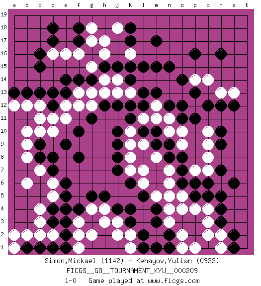 Last move : 1-0 2022 February 24 12:43:32 [Event "FICGS__GO__TOURNAMENT_KYU__000209"] [Site "FICGS"] [Date "2021.06.14"] [Round "1"] [Black "Simon,Mickael"] [White "Kehayov,Yulian"] [Result "1-0"] [Rating 1 "1142"] [Rating 2 "0922"] 1.r16 q4 2.d17 k16 3.d4 q10 4.c15 d10 5.p16 o4 6.k3 h17 7.m17 p14 8.n15 d6 9.f4 h3 10.j4 h4 11.h5 f3 12.e3 g4 13.g5 f2 14.e2 j3 15.k4 k2 16.l2 k1 17.m3 g2 18.q12 q14 19.o12 r13 20.r12 s13 21.s12 n14 22.m15 m14 23.l15 l14 24.k15 j14 25.k14 k13 26.j15 h14 27.l13 m12 28.l12 l11 29.k12 j13 30.m13 n13 31.n12 m11 32.o14 n11 33.o11 o10 34.k11 k10 35.q6 q8 36.r4 q3 37.r3 r2 38.s2 r1 39.o6 n3 40.n2 o2 41.m1 n4 42.m4 h16 43.h15 g15 44.g14 g13 45.f14 f13 46.e14 h13 47.e13 e12 48.d12 e11 49.j10 k9 50.j9 k8 51.j8 k7 52.j7 f16 53.f17 g17 54.f18 g18 55.k18 j18 56.k17 e16 57.d18 d16 58.c16 c12 59.c13 c11 60.m9 m8 61.n9 o9 62.n8 n7 63.o7 n6 64.o8 n5 65.l10 n10 66.k6 l7 67.r9 q9 68.r10 q7 69.q5 r6 70.r5 o5 71.p5 p4 72.d8 c7 73.c8 c4 74.e6 d5 75.e5 c3 76.r7 p12 77.p11 o13 78.p13 l9 79.m10 l6 80.l5 m5 81.s6 b12 82.b13 a12 83.g11 f12 84.f8 b8 85.c9 b9 86.a13 c10 87.d7 b6 88.b1 c2 89.c1 b2 90.d1 a2 91.s1 p1 92.f10 d11 93.d13 f1 94.e9 o1 95.j12 b10 96.h12 g12 97.l1 j2 98.n1 q2 99.d3 d2 100.e1 p7 101.p6 a1 102.e4 1-0 Here are the names of the openings (joseki) played in the four corners : Corner d4 : d4 d6 Hoshi (Hwajeom, Seongjeom, Xingwei`) 4-4 Point. The star or hoshi (4-4) point, emphasizing influence at the potential expense of territory. Ikken Takagakari (Hankan Nop'dakeolch'im, Yi Gaojia, 1-Space High Approach). Black typically responds at 6-4 or 3-10. Black 4-10 is played when Black finds play on the right side advantageous. Black 4-8 or 3-8 may be played when Black has support at top. Player Black won this Go (weiqi, baduk) game. Follow this game move after move (download)Studying go is a wonderful way to develop both the creative as well as the logical abilities of children because to play it both sides of the brain are necessary. (Cho Chikun) Memory... is the diary that we all carry with us. (Oscar Wilde, The Importance of Being Earnest)
