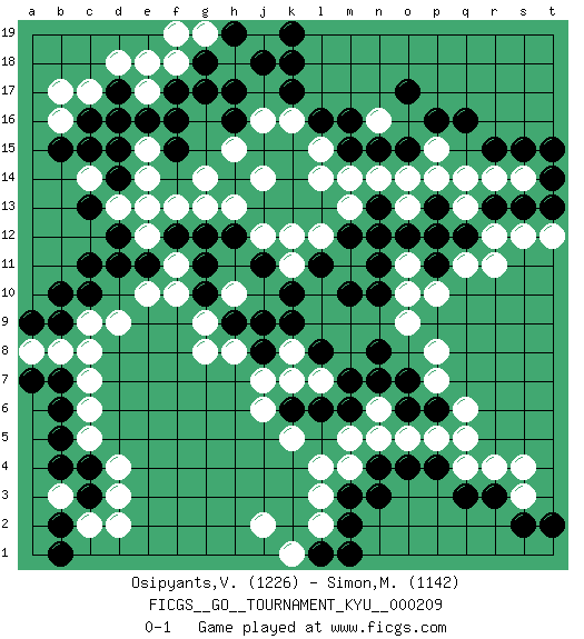 Last move : 0-1 2021 September 18 5:30:6 [Event "FICGS__GO__TOURNAMENT_KYU__000209"] [Site "FICGS"] [Date "2021.06.14"] [Round "1"] [Black "Osipyants,Vladimir"] [White "Simon,Mickael"] [Result "0-1"] [Rating 1 "1226"] [Rating 2 "1142"] 1.q16 d4 2.d16 q5 3.r3 c14 4.d12 r14 5.o17 r11 6.p4 e14 7.f16 g14 8.h16 d9 9.f12 f10 10.h12 j14 11.l16 l14 12.g10 f11 13.g11 g9 14.h9 g8 15.e11 e10 16.c11 h8 17.j9 p5 18.n4 o5 19.o4 r4 20.q3 n5 21.n8 m4 22.m3 l3 23.n3 l4 24.c3 d3 25.c4 c5 26.b5 c6 27.b6 c7 28.b7 b8 29.j8 j7 30.l8 p8 31.m12 n14 32.r15 q14 33.s15 n16 34.m15 m14 35.n15 o14 36.o15 c17 37.c16 b16 38.b15 b17 39.c15 f18 40.g18 e17 41.f17 e18 42.d17 d18 43.d14 e15 44.e16 d13 45.d15 e13 46.c13 e12 47.d11 g13 48.g12 h18 49.g17 g19 50.j18 f19 51.h17 j19 52.k18 c2 53.b2 d2 54.b1 k12 55.l11 j12 56.j11 k11 57.k10 l7 58.m7 k8 59.k9 k7 60.m6 m5 61.l6 k5 62.k6 j6 63.p13 p14 64.o12 o10 65.m10 k16 66.k17 j16 67.s13 s14 68.t14 s12 69.r13 q13 70.q12 r12 71.t13 n12 72.n11 o11 73.n13 p15 74.p16 l15 75.m16 l12 76.n10 o9 77.o7 p7 78.h19 b3 79.b4 h18 80.k19 o13 81.p12 m13 82.n12 h15 83.h19 l2 84.m2 s3 85.s2 s4 86.t2 q4 87.l1 k1 88.m1 j2 89.b9 c9 90.b10 a8 91.a7 t12 92.t15 q11 93.o6 n6 94.n7 h13 95.p11 p10 96.p6 q6 97.a9 c8 98.c10 f13 99.f15 h10 0-1 Here are the names of the openings (joseki) played in the four corners : Corner q4 : q5 r3 Takamoku (Gomok, Gaomu`) 5-4 Point. The takamoku (high) point (5-4). With its emphasis on influence, the 5-4 point complements the 4-4 (hoshi) point in creating an influence-oriented fuseki. San-san. Black plays the 3-3 when White has a stone at top such as marked. Corner d16 : d16 c14 Hoshi (Hwajeom, Seongjeom, Xingwei`) 4-4 Point. The star or hoshi (4-4) point, emphasizing influence at the potential expense of territory. Ikken Kakari (Hankan Keolch'im, Yi Gua`jiao~, 1-Space Low Approach). White 2 is the standard approach move to the 4-4. Corner q16 : q16 r14 Hoshi (Hwajeom, Seongjeom, Xingwei`) 4-4 Point. The star or hoshi (4-4) point, emphasizing influence at the potential expense of territory. Ikken Kakari (Hankan Keolch'im, Yi Gua`jiao~, 1-Space Low Approach). White 2 is the standard approach move to the 4-4. Player White won this Go (weiqi, baduk) game. Follow this game move after move (download)There is damezumari at the bamboo joint. (Anonymous) If things go wrong, don't go with them. (Roger Babson)