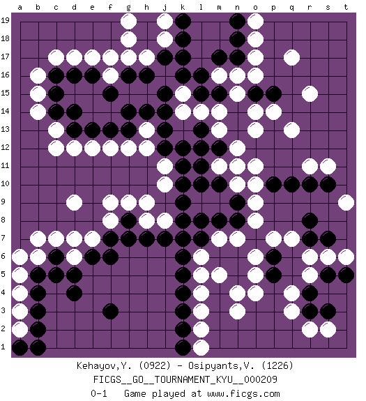 Last move : 0-1 2021 August 11 12:19:50 [Event "FICGS__GO__TOURNAMENT_KYU__000209"] [Site "FICGS"] [Date "2021.06.14"] [Round "1"] [Black "Kehayov,Yulian"] [White "Osipyants,Vladimir"] [Result "0-1"] [Rating 1 "0922"] [Rating 2 "1226"] 1.d4 q4 2.d16 q17 3.k3 r15 4.k11 d9 5.q10 r6 6.k17 c12 7.o15 q13 8.k7 d6 9.f3 f12 10.g14 m16 11.n17 m14 12.m15 n15 13.l15 n16 14.n14 o14 15.n13 o16 16.p15 p14 17.k16 c17 18.m17 o17 19.n18 o18 20.n19 o19 21.l16 r11 22.r8 n3 23.r3 q3 24.r4 r5 25.s5 s6 26.t5 s2 27.s3 r2 28.s7 t6 29.r7 o11 30.p6 o9 31.m10 h9 32.f7 f9 33.c6 c7 34.c5 e7 35.f6 b7 36.e6 f8 37.g7 h8 38.h7 d17 39.e16 e17 40.d14 g17 41.g16 b14 42.c15 b15 43.c14 c13 44.f13 g12 45.g13 h12 46.j13 h17 47.h16 o5 48.n5 n4 49.n6 o6 50.o7 n7 51.p5 o4 52.n8 m7 53.m6 l6 54.k6 l5 55.k5 p7 56.m8 o8 57.n9 n10 58.l8 q7 59.p10 o10 60.l7 m5 61.s10 s11 62.r10 t9 63.d5 d7 64.k12 m11 65.l10 m13 66.m12 n12 67.l12 a4 68.b4 a5 69.b5 a3 70.b3 a2 71.b2 b6 72.l13 o13 73.l11 j10 74.k9 l4 75.k4 l3 76.k2 l2 77.k1 l1 78.j17 f16 79.f15 f17 80.h18 g18 81.h19 g19 82.d13 d12 83.e13 j18 84.k18 j19 85.k19 j8 86.j7 h13 87.h14 e12 88.c16 b16 89.j12 j11 90.g8 g9 91.b1 l14 92.a1 a6 93.k8 k14 94.j14 k15 95.j15 n11 96.k10 pass 0-1 Here are the names of the openings (joseki) played in the four corners : Corner d4 : d4 d9 Hoshi (Hwajeom, Seongjeom, Xingwei`) 4-4 Point. The star or hoshi (4-4) point, emphasizing influence at the potential expense of territory. Corner d16 : d16 c12 Hoshi (Hwajeom, Seongjeom, Xingwei`) 4-4 Point. The star or hoshi (4-4) point, emphasizing influence at the potential expense of territory. Player White won this Go (weiqi, baduk) game. Follow this game move after move (download)Do not fear furikawari. (Anonymous) There is a very easy way to return from a casino with a small fortune : go there with a large one. (Jack Yelton)