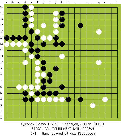 Last move : 0-1 2021 October 17 14:30:14 [Event "FICGS__GO__TOURNAMENT_KYU__000209"] [Site "FICGS"] [Date "2021.06.14"] [Round "1"] [Black "Agronow,Cosmo"] [White "Kehayov,Yulian"] [Result "0-1"] [Rating 1 "0735"] [Rating 2 "0922"] 1.d16 q15 2.d4 r4 3.n16 d10 4.g10 k4 5.k6 q10 6.n4 k11 7.j13 j16 8.k13 g4 9.g6 g8 10.j9 f9 11.g9 f8 12.h7 f6 13.f5 d6 14.d5 e5 15.e4 e6 16.g5 c6 17.g7 f7 18.h8 h4 19.j5 j4 20.l4 f4 21.h5 f10 22.f11 e11 23.f12 f15 24.e13 d12 25.e12 d13 26.d14 c13 27.c14 b13 28.b14 a13 29.a14 e17 30.d17 e16 31.e15 g16 32.k16 j18 33.k18 j17 34.k17 e18 35.d18 e19 36.d19 j15 37.f14 g14 38.g13 h14 39.j14 p3 0-1 This go game has been lost on time (started : 2021.06.14 11:29:38) Here are the names of the openings (joseki) played in the four corners : Corner q16 : q15 n16 Takamoku (Gomok, Gaomu`) 5-4 Point. The takamoku (high) point (5-4). With its emphasis on influence, the 5-4 point complements the 4-4 (hoshi) point in creating an influence-oriented fuseki. Corner q4 : r4 n4 Komoku (Somok, Xiao~mu`) 3-4 Point. The komoku (3-4) point is the traditional corner enclosure move.. Corner d4 : d4 g4 Hoshi (Hwajeom, Seongjeom, Xingwei`) 4-4 Point. The star or hoshi (4-4) point, emphasizing influence at the potential expense of territory. Niken Takagakari (Dukan Nop'dakeolch'im, E`r Gaojia, 2-Space High Approach). White 2 is a light approach move. Rarely played in even games, White 2 is typically employed in handicap games. Black continues with 6-4 or 3-10. In Korean Sunjang Baduk Black has a stone on 8-4. Player White won this Go (weiqi, baduk) game. Follow this game move after move (download)Don't defend - extend ! (Bill Taylor) Logic : The art of thinking and reasoning in strict accordance with the limitations and incapacities of the human misunderstanding. (Ambrose Bierce)