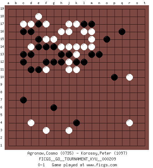 Last move : 0-1 2021 September 21 12:8:27 [Event "FICGS__GO__TOURNAMENT_KYU__000209"] [Site "FICGS"] [Date "2021.06.14"] [Round "1"] [Black "Agronow,Cosmo"] [White "Korossy,Peter"] [Result "0-1"] [Rating 1 "0735"] [Rating 2 "1097"] 1.d16 d4 2.q16 r4 3.c7 f3 4.g6 j3 5.k4 f17 6.h15 j17 7.k16 k17 8.l17 l16 9.l15 m16 10.o15 m15 11.m13 l14 12.k15 k14 13.j15 m14 14.n13 r10 15.p10 k11 16.k12 j12 17.j13 k13 18.l12 j14 19.h13 h14 20.g14 g13 21.h12 j11 22.g12 f13 23.m17 g15 24.f14 f15 25.e14 e13 26.d13 e12 27.d11 f11 28.e11 d14 29.e15 d12 30.c13 h16 31.f12 j16 32.c12 c17 33.c16 d17 34.e17 e18 0-1 This go game has been lost on time (started : 2021.06.14 11:29:38) Here are the names of the openings (joseki) played in the four corners : Corner d4 : d4 c7 Hoshi (Hwajeom, Seongjeom, Xingwei`) 4-4 Point. The star or hoshi (4-4) point, emphasizing influence at the potential expense of territory. Niken Kakari (Dukan Keolch'im, E`r Gua`jiao~, 2-Space Low Approach). White typically answers by 7-3 or 3-5 (which is not joseki). Corner d16 : d16 f17 Hoshi (Hwajeom, Seongjeom, Xingwei`) 4-4 Point. The star or hoshi (4-4) point, emphasizing influence at the potential expense of territory. Ikken Kakari (Hankan Keolch'im, Yi Gua`jiao~, 1-Space Low Approach). White 2 is the standard approach move to the 4-4. Player White won this Go (weiqi, baduk) game. Follow this game move after move (download)Balance is not what players strike for, and if it does arise, it is in spite of them. (Pierre Audouard) Computers have lots of memory but no imagination. (Anonymous)