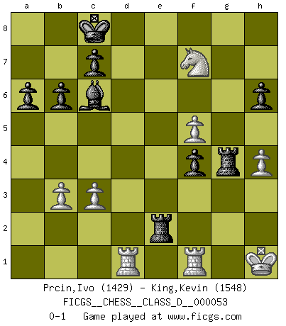 Last move : 0-1 2007 October 6 8:12:30 [Event "FICGS__CHESS__CLASS_D__000053"] [Site "FICGS"] [Date "2007.07.13"] [Round "1"] [White "Prcin,Ivo"] [Black "King,Kevin"] [Result "0-1"] [WhiteElo "1429"] [BlackElo "1548"] 1.e4 e5 2.Nf3 Nc6 3.Bb5 a6 4.Bxc6 dxc6 5.O-O f6 6.d4 exd4 7.Qxd4 Qxd4 8.Nxd4 Bd7 9.Be3 O-O-O 10.c3 Ne7 11.f4 c5 12.Nf3 b6 13.Nbd2 Ng6 14.f5 Ne5 15.Nxe5 fxe5 16.Bg5 Re8 17.Nf3 Bd6 18.Rad1 Rhf8 19.g4 c4 20.Bh4 Bc5+ 21.Kg2 Be3 22.Bg3 Bf4 23.b3 cxb3 24.axb3 g6 25.Bxf4 exf4 26.Ng5 gxf5 27.exf5 Re2+ 28.Kg1 Rg8 29.h4 h6 30.Nf7 Rxg4+ 31.Kh1 Bc6+ 0-1 Ruy Lopez : Exchange, Gligoric variation Kingside Castling by player White (move 5) Queenside Castling by player Black (move 9) Player Black won this chess game. Follow this game move after move (download)Via the squares on the chessboard, the Indians explain the movement of time and the age, the higher influences which control the world and the ties which link Chess with the human soul. (Al-Masudi) Ein Teil des Fehlers ist immer korrekt. (Savielly Grigorievitsch Tartakower) Dejen al perfeccionista jugar por correo. (Yasser Seirawan) Le profane ne songe pas à la somme de jouissance dont il se prive, qui méconnaît ce jeu aux ressources aussi variées que passionnantes. (Jean-Marie Jeanton-Lamarche) It is not titles that honor men, but men that honor titles. (Niccolo Machiavelli)