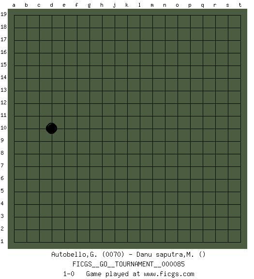 Last move : 1-0 2021 July 16 8:38:7 [Event "FICGS__GO__TOURNAMENT__000085"] [Site "FICGS"] [Date "2021.06.14"] [Round "1"] [Black "Autobello,Giovanni"] [White "Danu saputra,Mulyadi"] [Result "1-0"] [Rating 1 "0070"] 1.d10 1-0 This go game has been lost on time (started : 2021.06.14 19:18:51) Here are the names of the openings (joseki) played in the four corners : Player Black won this Go (weiqi, baduk) game. Follow this game move after move (download)A meijin needs no joseki. (Anonymous) Fame, I have already. Now I need the money. (an elderly Steinitz)