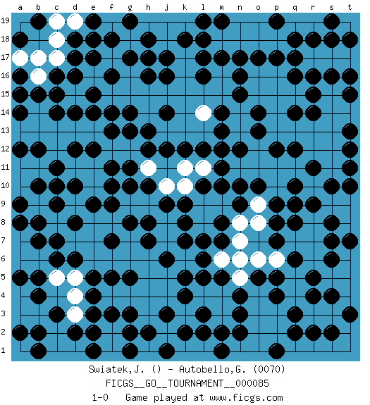 Last move : 1-0 2022 March 25 15:30:4 [Event "FICGS__GO__TOURNAMENT__000085"] [Site "FICGS"] [Date "2021.06.14"] [Round "1"] [Black "Swiatek,Janusz"] [White "Autobello,Giovanni"] [Result "1-0"] [Rating 2 "0070"] 1.q16 d4 2.c16 d16 3.d17 d15 4.e17 e16 5.c15 c17 6.d14 f17 7.f16 f15 8.e15 g16 9.f14 g15 10.c6 e16 11.r4 e18 12.d18 d19 13.f18 g18 14.e19 f19 15.e18 c18 16.d16 b16 17.b15 a15 18.a14 b14 19.a16 b17 20.g14 h14 21.h13 j13 22.j14 h15 23.j12 k13 24.h12 k14 25.e5 j15 26.f3 g13 27.f13 g12 28.h10 e13 29.e12 h11 30.g11 f12 31.e14 d13 32.d12 c13 33.f11 f10 34.b4 j10 35.j9 h9 36.g10 j8 37.k9 k10 38.k8 l9 39.l10 l11 40.m10 l8 41.k7 j7 42.j6 k6 43.l7 j5 44.m7 h6 45.l5 m9 46.m11 m12 47.n9 n8 48.m8 n7 49.l3 m6 50.m5 n5 51.n4 o4 52.o5 n6 53.p5 e11 54.l6 m4 55.n3 o3 56.n2 d11 57.f9 e10 58.e9 c12 59.c10 l4 60.k4 m3 61.m2 n11 62.n12 o12 63.o17 n13 64.l12 k11 65.k12 l13 66.m14 o9 67.m13 n14 68.n12 g9 69.g8 m15 70.o10 p10 71.n10 o11 72.m12 l14 73.n15 l15 74.q10 q11 75.p9 p11 76.q9 r10 77.r9 s9 78.s8 t8 79.s10 t9 80.r11 o15 81.n16 m16 82.m17 r8 83.s7 r6 84.s6 r7 85.t10 t6 86.r5 s5 87.t7 t5 88.s4 t4 89.t3 q5 90.q6 q4 91.p4 p3 92.q3 k16 93.r16 o2 94.l17 k17 95.l18 d5 96.d6 l19 97.k18 e6 98.f5 p6 99.p7 o6 100.h18 j18 101.j17 j19 102.h17 n18 103.n17 m18 104.g17 h19 105.f16 f6 106.g5 g6 107.h8 d9 108.c9 c8 109.d8 d10 110.c11 h4 111.g3 d7 112.c7 e7 113.b8 o18 114.p17 o16 115.l16 r12 116.j16 k15 117.g19 k19 118.m19 n19 119.l19 s13 120.r14 q15 121.r15 p15 122.q14 p18 123.q18 r17 124.r18 s17 125.s18 t17 126.q17 g4 127.e3 f4 128.e4 d3 129.d2 q19 130.p19 o19 131.p19 r19 132.s19 c2 133.e2 q7 134.q8 p14 135.o13 p13 136.o14 s14 137.s16 d1 138.e1 t16 139.t18 s15 140.t15 t14 141.t16 s11 142.t12 s12 143.t11 p16 144.q12 q13 145.p12 c5 146.b5 a13 147.a15 b6 148.b7 a6 149.c3 b3 150.b2 c1 151.b1 a3 152.a2 n1 153.m1 o1 154.q2 h3 155.h2 j2 156.g2 h1 157.g1 a4 158.a5 a7 159.a8 b11 160.b10 a10 161.a9 d11 162.b12 a11 163.a12 b13 164.c14 k3 165.k2 k1 166.j3 j4 167.j1 l1 168.l2 r13 169.t13 o8 170.p8 e8 171.k5 r3 172.r2 s3 173.s2 e10 174.d10 e11 175.h16 g12 176.j14 f12 177.g13 p2 178.p1 h5 179.h7 g7 180.j6 a17 181.b19 c19 182.a18 f8 183.f7 l14 184.f10 1-0 Here are the names of the openings (joseki) played in the four corners : Corner d16 : c16 d16 Komoku (Somok, Xiao~mu`) 3-4 Point. The komoku (3-4) point is the traditional corner enclosure move.. Corner d4 : d4 c6 Hoshi (Hwajeom, Seongjeom, Xingwei`) 4-4 Point. The star or hoshi (4-4) point, emphasizing influence at the potential expense of territory. Ikken Kakari (Hankan Keolch'im, Yi Gua`jiao~, 1-Space Low Approach). Black 2 is the standard approach move to the 4-4. Corner q4 : r4 l9 Komoku (Somok, Xiao~mu`) 3-4 Point. The komoku (3-4) point is the traditional corner enclosure move.. Corner q16 : q16 l11 Hoshi (Hwajeom, Seongjeom, Xingwei`) 4-4 Point. The star or hoshi (4-4) point, emphasizing influence at the potential expense of territory. Player Black won this Go (weiqi, baduk) game. Follow this game move after move (download)If you lose by one point, take a rest. (Anonymous) Perseverance does not equal worthiness. Next time you want to get my attention, wear something fun. Low-riding jeans are hot. (Gregory House, House M.D.)