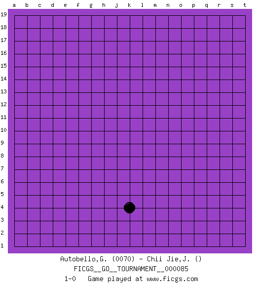Last move : 1-0 2021 July 16 8:38:7 [Event "FICGS__GO__TOURNAMENT__000085"] [Site "FICGS"] [Date "2021.06.14"] [Round "1"] [Black "Autobello,Giovanni"] [White "Chii Jie,Joanne Wong"] [Result "1-0"] [Rating 1 "0070"] 1.k4 1-0 This go game has been lost on time (started : 2021.06.14 19:18:51) Here are the names of the openings (joseki) played in the four corners : Player Black won this Go (weiqi, baduk) game. Follow this game move after move (download)If your stone is capped, play the knight's move. (Anonymous) Any activity becomes creative when the doer cares about doing it right or doing it better. (John Updike)