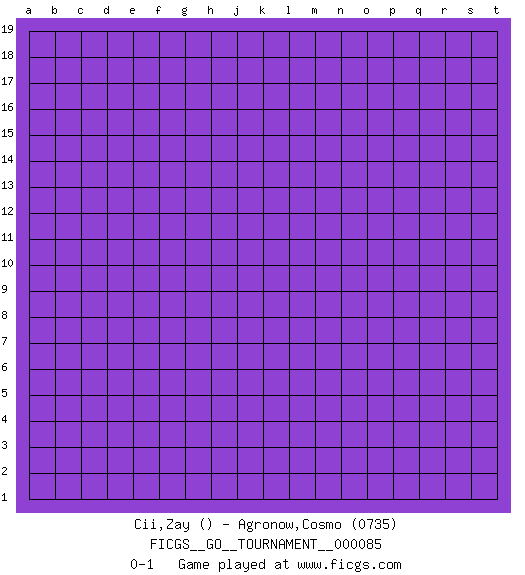 Last move : 0-1 2021 July 15 2:14:56 [Event "FICGS__GO__TOURNAMENT__000085"] [Site "FICGS"] [Date "2021.06.14"] [Round "1"] [Black "Cii,Zay"] [White "Agronow,Cosmo"] [Result "0-1"] [Rating 2 "0735"] 0-1 This go game has been lost on time (started : 2021.06.14 19:18:51) Here are the names of the openings (joseki) played in the four corners : Player White won this Go (weiqi, baduk) game. Follow this game move after move (download)When in doubt, remove the enemy stones from the board. (Bill Taylor) Perhaps the current trend of many chess professionals taking up the more lucrative pastime of poker is not a wholly negative one. It may not be too late for humans to relearn how to take risks in order to innovate and thereby maintain the advanced lifestyles we enjoy. And if it takes a poker-playing supercomputer to remind us that we can't enjoy the rewards without taking the risks, so be it. (The Chess Master and the Computer, by Garry Kasparov - 2010)