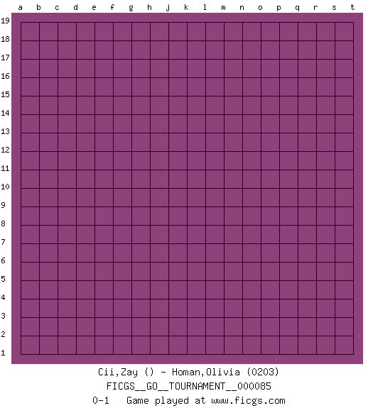 Last move : 0-1 2021 July 15 2:14:56 [Event "FICGS__GO__TOURNAMENT__000085"] [Site "FICGS"] [Date "2021.06.14"] [Round "1"] [Black "Cii,Zay"] [White "Homan,Olivia"] [Result "0-1"] [Rating 2 "0203"] 0-1 This go game has been lost on time (started : 2021.06.14 19:18:51) Here are the names of the openings (joseki) played in the four corners : Player White won this Go (weiqi, baduk) game. Follow this game move after move (download)Win the early ko to win the game. (Anonymous) A good teacher is like a candle - it consumes itself to light the way for others. (Author unknown)