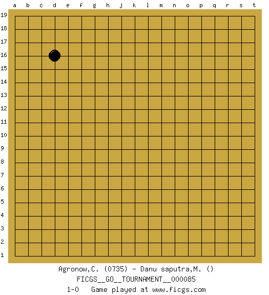 Last move : 1-0 2021 July 16 8:38:7 [Event "FICGS__GO__TOURNAMENT__000085"] [Site "FICGS"] [Date "2021.06.14"] [Round "1"] [Black "Agronow,Cosmo"] [White "Danu saputra,Mulyadi"] [Result "1-0"] [Rating 1 "0735"] 1.d16 1-0 This go game has been lost on time (started : 2021.06.14 19:18:51) Here are the names of the openings (joseki) played in the four corners : Player Black won this Go (weiqi, baduk) game. Follow this game move after move (download)When your opponent is thick, you must also become thick. (Otake Hideo, 9p) Horse racing is animated roulette. (Roger Kahn)