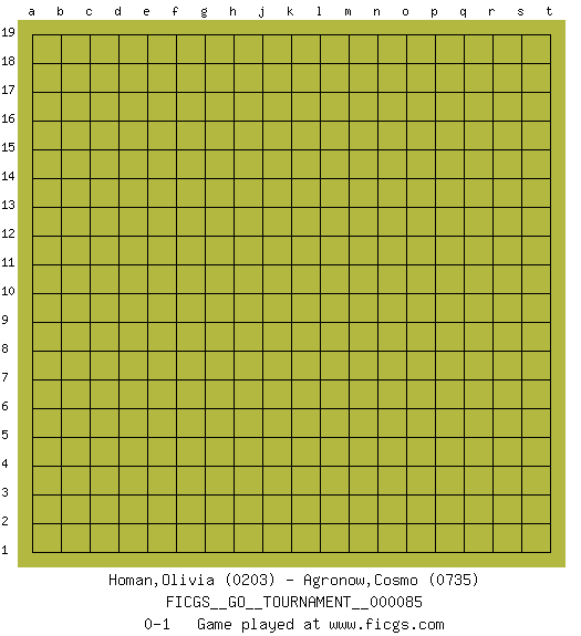 Last move : 0-1 2021 July 15 2:14:56 [Event "FICGS__GO__TOURNAMENT__000085"] [Site "FICGS"] [Date "2021.06.14"] [Round "1"] [Black "Homan,Olivia"] [White "Agronow,Cosmo"] [Result "0-1"] [Rating 1 "0203"] [Rating 2 "0735"] 0-1 This go game has been lost on time (started : 2021.06.14 19:18:51) Here are the names of the openings (joseki) played in the four corners : Player White won this Go (weiqi, baduk) game. Follow this game move after move (download)One point in the center is worth ten in the corner. (Anonymous) Real knowledge is to know the extent of one's ignorance. (Confucius)