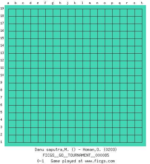Last move : 0-1 2021 July 15 2:14:56 [Event "FICGS__GO__TOURNAMENT__000085"] [Site "FICGS"] [Date "2021.06.14"] [Round "1"] [Black "Danu saputra,Mulyadi"] [White "Homan,Olivia"] [Result "0-1"] [Rating 2 "0203"] 0-1 This go game has been lost on time (started : 2021.06.14 19:18:51) Here are the names of the openings (joseki) played in the four corners : Player White won this Go (weiqi, baduk) game. Follow this game move after move (download)There are players who don't accept exchange: they play many moves that perpetuate a previous state of the game. (Pierre Audouard) The general who wins the battle makes many calculations in his temple before the battle is fought. The general who loses makes but few calculations beforehand. (Sun Tzu)