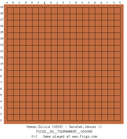 Last move : 0-1 2021 July 15 2:14:56 [Event "FICGS__GO__TOURNAMENT__000085"] [Site "FICGS"] [Date "2021.06.14"] [Round "1"] [Black "Homan,Olivia"] [White "Swiatek,Janusz"] [Result "0-1"] [Rating 1 "0203"] 0-1 This go game has been lost on time (started : 2021.06.14 19:18:51) Here are the names of the openings (joseki) played in the four corners : Player White won this Go (weiqi, baduk) game. Follow this game move after move (download)Each step in a ladder is worth 7 points. (Anonymous) Coffee just isn't my cup of tea. (Unknown)