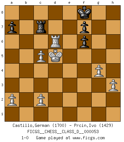 Last move : 1-0 2007 September 18 14:24:56 [Event "FICGS__CHESS__CLASS_D__000053"] [Site "FICGS"] [Date "2007.07.13"] [Round "1"] [White "Castillo,German"] [Black "Prcin,Ivo"] [Result "1-0"] [WhiteElo "1700"] [BlackElo "1429"] 1.d4 Nf6 2.Nc3 d5 3.e4 dxe4 4.f3 Nc6 5.d5 Ne5 6.fxe4 e6 7.Nf3 Nxf3+ 8.Qxf3 exd5 9.exd5 Bd6 10.Bg5 O-O 11.Bxf6 Qxf6 12.Qxf6 gxf6 13.O-O-O Re8 14.h3 c6 15.g4 Bb4 16.dxc6 Bxc3 17.bxc3 bxc6 18.Bg2 Bb7 19.Rd7 Bc8 20.Rd6 Re6 21.Rxc6 Rxc6 22.Bxc6 Rb8 23.Be4 Bb7 24.Bxb7 Rxb7 25.Rf1 Kg7 26.Rf5 Kg6 27.c4 h5 28.Rxh5 Rc7 29.c5 Rc6 30.Kd2 Ra6 31.Rd5 Rc6 32.Kd3 Kg7 33.Kd4 Kf8 34.Rd6 Rc7 35.Kd5 1-0 Queen's pawn game Kingside Castling by player Black (move 10) Queenside Castling by player White (move 13) Player White won this chess game. Follow this game move after move (download)The battle for the ultimate truth will never be won. And that's why Chess is so fascinating. (Hans Kmoch) Ich brauche nur einen Blick auf das Schachbrett zu werfen, und weiß schon, was in der Stellung steckt, was geschehen kann und was geschehen wird. Alle übrigen suchen und prüfen, ich aber weiß es! (José Raúl Capablanca) Morphy probablemente fue el genio más grande de todos. (Bobby Fischer) Dans le domaine de la peinture, de la gravure et de la sculpture, dès la première décennie de notre siècle, les artistes abandonnent la représentation de la partie d'échecs pour se concentrer sur les pièces, sur les échiquiers et sur toutes les variations auxquelles les unes et les autres peuvent donner lieu. On passe en quelque sorte d'un thème social à un thème musical (au sens de la musica médiévale, c'est-à-dire d'une notion qui inclue le rythme, l'harmonie, la construction et la déconstruction, etc.). Graphiquement et picturalement, l'échiquier apparaît comme une structure ouverte, dynamique, d'une richesse infinie, autorisant toutes les combinatoires et débouchant sur des mouvements et des rythmes de nature exponentielle. (Michel Pastoureau) There is a computer disease that anybody who works with computers knows about. It's a very serious disease and it interferes completely with the work. The trouble with computers is that you 'play' with them ! (Richard P. Feynman)