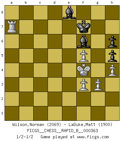 Last move : 1/2-1/2 2021 September 10 17:3:19 [Event "FICGS__CHESS__RAPID_B__000363"] [Site "FICGS"] [Date "2021.06.15"] [Round "1"] [White "Wilson,Norman"] [Black "LaDuke,Matt"] [Result "1/2-1/2"] [WhiteElo "2069"] [BlackElo "1900"] 1.c4 g6 2.d4 Nf6 3.Nf3 Bg7 4.g3 c6 5.Nc3 d5 6.cxd5 cxd5 7.Bg2 O-O 8.Ne5 e6 9.O-O Nfd7 10.Nf3 Nc6 11.Bf4 Nf6 12.h4 Bd7 13.Rc1 Qe7 14.a3 Rfc8 15.Rc2 Na5 16.Ne5 Be8 17.Qc1 Nb3 18.Qe3 Qd8 19.Rd1 Na5 20.Qd3 h6 21.Bf3 Nh5 22.Bxh5 gxh5 23.Rdc1 f6 24.Nf3 Nc6 25.Bd2 Bf7 26.Na4 e5 27.Qb5 Rcb8 28.Nc5 a6 29.Qa4 b5 30.Qb3 Ne7 31.a4 b4 32.a5 Qxa5 33.dxe5 fxe5 34.Nd7 d4 35.Qd3 Bg6 36.Qc4+ Bf7 37.Qc5 Qxc5 38.Rxc5 e4 39.Nxb8 exf3 40.Nc6 Nxc6 41.Rxc6 a5 42.exf3 d3 43.Rc8+ Rxc8 44.Rxc8+ Kh7 45.Rc7 Kg8 46.Rc8+ Kh7 47.Rc7 Kg8 48.Rd7 Bxb2 49.Rxd3 b3 50.Rd8+ Kg7 51.Ra8 Bd4 52.Bc1 b2 53.Bxb2 Bxb2 54.Rxa5 Kg6 55.Kf1 Bc4+ 56.Kg2 Be6 57.Ra6 Kf7 58.Ra5 Kg6 59.Ra6 Kf7 60.Ra4 Bf6 61.Kf1 Kg7 62.Ke2 Bf5 63.Ke3 Bd8 64.Ra6 Bc8 65.Rc6 Bf5 66.Ra6 Bg6 67.Ra7+ Kf6 68.Ra6+ Kg7 69.f4 Bf5 70.f3 Bc8 71.Rd6 Bf6 72.Rc6 Bh3 73.Rc5 Kg6 74.Ke4 Bd7 75.f5+ Kf7 76.Ra5 Bc6+ 77.Kf4 Be8 78.Ra7+ 1/2-1/2 English Opening Kingside Castling by player Black (move 7) Kingside Castling by player White (move 9) This chess game ended in a draw. Follow this game move after move (download)My God, Bobby Fischer plays so simply. (Alexei Suetin) Ich habe kein Problem mit Frauen, sondern nur mit dem Niveau ihres Schachspiels (Judith Polgar) El Ajedrez es una guerra en un tablero. El objetivo es aplastar la mente del oponente. (Bobby Fischer) Le génie consiste à savoir transgresser les règles au moment opportun. (Teichmann) Big Chess is a place for big hallucinations. (Thibault de Vassal)