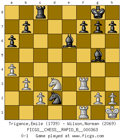 Last move : 0-1 2021 July 22 8:46:51 [Event "FICGS__CHESS__RAPID_B__000363"] [Site "FICGS"] [Date "2021.06.15"] [Round "1"] [White "Trigance,Emile"] [Black "Wilson,Norman"] [Result "0-1"] [WhiteElo "1739"] [BlackElo "2069"] 1.e4 c5 2.Nf3 d6 3.d4 cxd4 4.Nxd4 Nf6 5.Nc3 a6 6.f4 e5 7.Nf3 Nbd7 8.a4 Qc7 9.Bd3 Be7 10.O-O O-O 11.Kh1 Nc5 12.Be3 Bd7 13.b3 Nxd3 14.Qxd3 Rac8 15.fxe5 dxe5 16.Bd2 Be6 17.Rac1 Rfd8 18.Qe2 Rxd2 19.Qxd2 Qxc3 20.Qxc3 Rxc3 21.Nxe5 Nxe4 22.Rf3 Rc8 23.Nd3 Bg5 24.Rcf1 Nd2 0-1 Sicilian : Najdorf, 6.f4 Kingside Castling by player White (move 10) Kingside Castling by player Black (move 10) Player Black won this chess game. Follow this game move after move (download)Chess is like life. (Boris Spassky) Wie, soll nun auch die Opposition abgeschafft werden? Ja, es tut mir leid, Ihnen diesen Schmerz nicht ersparen zu können. (Aaron Nimzowitsch) Las combinaciones han sido siempre el aspecto más intrigante del Ajedrez. Los Maestros las buscan, el público las aplauden, los críticos las alaban. La razón se debe a que las combinaciones hacen posible que el Ajedrez sea más que un ejercicio matemático con una carencia de vida. Ellas son la poesía del juego, son del Ajedrez lo que la melodía es de la música. Ellas representan el triunfo de la mente sobre la materia. (Reuben Fine) A chaque perte on perd un peu de soi. (Joël Lautier) Methinks King Thibault should dub Marius Zubac a knight of the square board... I mean table, henceforth addressing him as Sir Marius, and bestow on him a suitable land from the kingdom of FICGS & marry him off to a worthy, fair maiden, lest he slice our heads with his mighty sword in his wrath. (Dinesh De Silva)