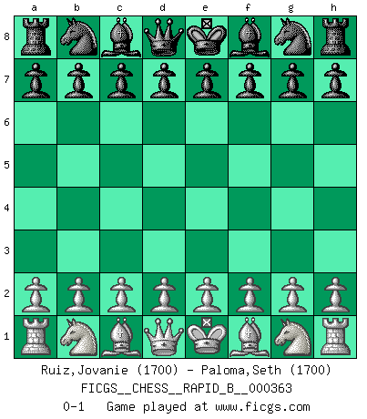 Last move : 0-1 2021 July 16 8:38:7 [Event "FICGS__CHESS__RAPID_B__000363"] [Site "FICGS"] [Date "2021.06.15"] [Round "1"] [White "Ruiz,Jovanie"] [Black "Paloma,Seth"] [Result "0-1"] [WhiteElo "1700"] [BlackElo "1700"] 0-1 This chess game has been lost on time (started : 2021.06.15 17:40:14) Player Black won this chess game. Follow this game move after move (download)You can only get good at Chess if you love the game. (Bobby Fischer) Im Schach gewinnt jeder. Hat man Freunde am Spiel - und das ist die Hauptsache - ist auch der Verlust einer Partie kein Unglück. (David Bronstein) El Ajedrez demanda una total concentración. (Bobby Fischer) Aux échecs, l'amour-propre est satisfait quand on remporte la victoire, mais il n'y a pas de honte à être battu. (Benjamin Franklin) Wikichess, chess moves explained by 'experimented' players. (Thibault de Vassal)