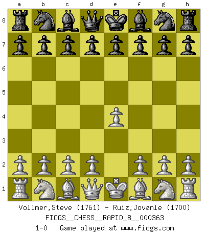 Last move : 1-0 2021 July 16 8:38:7 [Event "FICGS__CHESS__RAPID_B__000363"] [Site "FICGS"] [Date "2021.06.15"] [Round "1"] [White "Vollmer,Steve"] [Black "Ruiz,Jovanie"] [Result "1-0"] [WhiteElo "1761"] [BlackElo "1700"] 1.e4 1-0 This chess game has been lost on time (started : 2021.06.15 17:40:14) King's pawn Opening Player White won this chess game. Follow this game move after move (download)A bad day of Chess is better than any good day at work. (Anonymous) Wenn Du nicht kämpfst, um anderen etwas zu beweisen, sondern nur für Dich selbst, dann bist du fast unbesiegbar. (Garry Kasparov) Si un gobernante no entiende al Ajedrez, ¿como puede governar él un reinado?. (El Rey Khusros II) J'apprécie les joueurs d'est-indienne, c'est grâce à eux que je nourris ma famille depuis tant d'années. (Petrosian) It is not titles that honor men, but men that honor titles. (Niccolo Machiavelli)