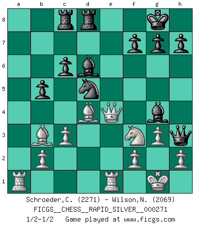 Last move : 1/2-1/2 2021 July 8 8:56:22 [Event "FICGS__CHESS__RAPID_SILVER__000271"] [Site "FICGS"] [Date "2021.06.17"] [Round "2"] [White "Schroeder,Christoph"] [Black "Wilson,Norman"] [Result "1/2-1/2"] [WhiteElo "2271"] [BlackElo "2069"] 1.e4 e5 2.Nf3 Nc6 3.Bb5 a6 4.Ba4 Nf6 5.O-O Be7 6.Re1 b5 7.Bb3 O-O 8.c3 d5 9.exd5 Nxd5 10.Nxe5 Nxe5 11.Rxe5 c6 12.d3 Bd6 13.Re1 Bf5 14.Qf3 Qh4 15.g3 Qh3 16.Be3 Bxd3 17.Nd2 Bf5 18.Bd4 Rfd8 19.a4 Bg4 20.Qe4 Rac8 21.axb5 axb5 22.Nf3 Bf5 23.Qe2 Bg4 24.Qe4 1/2-1/2 Ruy Lopez : Closed, 7...O-O Kingside Castling by player White (move 5) Kingside Castling by player Black (move 7) This chess game ended in a draw. Follow this game move after move (download)A player surprised is half beaten. (Proverb) Kann Schach nicht schließlich das Nationalspiel der Deutschen werden? Und welche weiteren Ausblicke bieten sich dann dar! Welche Hebung des allgemeinen Kultur-Niveaus, ja der Moral, wenn das Schachbrett den Kartentisch verdrängen würde! Wahrlich, ein Ziel, des Schweißes der Edlen wert! (Siegbert Tarrasch) Aquellos que dicen entender al Ajedrez, no entienden nada. (Robert Hubner) A chaque perte on perd un peu de soi. (Joël Lautier) Hardware: the parts of a computer that can be kicked. (Jeff Persis)