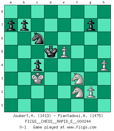 Last move : 0-1 2021 October 11 18:48:55 [Event "FICGS__CHESS__RAPID_E__000244"] [Site "FICGS"] [Date "2021.06.21"] [Round "1"] [White "Joubert,Hennie"] [Black "Piantadosi,Angelo"] [Result "0-1"] [WhiteElo "1413"] [BlackElo "1475"] 1.e4 Nf6 2.e5 Nd5 3.d4 d6 4.c4 Nb6 5.f4 dxe5 6.fxe5 e6 7.Nc3 c5 8.d5 exd5 9.cxd5 Bf5 10.Bb5+ Bd7 11.Bxd7+ N8xd7 12.Nf3 c4 13.O-O Bc5+ 14.Kh1 O-O 15.Bf4 Re8 16.Re1 Nf8 17.Qd2 Ng6 18.Bg3 Ne7 19.d6 Ng6 20.Rad1 Rc8 21.d7 Nxd7 22.Qxd7 Qxd7 23.Rxd7 Re7 24.Red1 Kf8 25.Rd8+ Rxd8 26.Rxd8+ Re8 27.Rxe8+ Kxe8 28.Ne4 Bb6 29.Nd6+ Kd7 30.Nxf7 Ke6 31.N7g5+ Ke7 32.Nxh7 Be3 33.h4 Nf4 34.Nhg5 Nd3 35.Ne4 Nxb2 36.Bf2 Bxf2 37.Nxf2 Ke6 38.Kg1 Nd3 39.Kf1 Nc1 40.Ke1 Nxa2 41.Kd2 Kd5 42.Kc2 Nb4+ 43.Kc3 Nc6 0-1 This chess game has been lost on time (started : 2021.06.21 0:45:19) Alekhine's defense : Four pawns attack Kingside Castling by player White (move 13) Kingside Castling by player Black (move 14) Player Black won this chess game. Follow this game move after move (download)I am the best player in the world and I am here to prove it. (Bobby Fischer) Im Fernschach kannst du während dem Spiel rauchen. (John Christen Knudsen) Botvinnik trató de alejar el misterio referente al Ajedrez, siempre relacionandolo a situaciones de la vida diaria. Solía llamar al Ajedrez un problema inexacto típico, similar a aquellos en que la gente tiene siempre que resolver a cada día. (Garry Kasparov) Une platitude souvent récitée à propos des Echecs est qu'une des choses les plus difficiles à réaliser est de gagner une position gagnante. Cela ne manque pas de sens mais, pour ma part, j'ai toujours trouvé plus difficile de gagner une position perdante. (Tim Krabbe) The only sure thing about luck is that it will change. (Wilson Mizner)