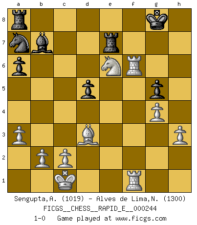 Last move : 1-0 2021 August 15 18:15:13 [Event "FICGS__CHESS__RAPID_E__000244"] [Site "FICGS"] [Date "2021.06.21"] [Round "1"] [White "Sengupta,Arnab"] [Black "Alves de Lima,Neemias"] [Result "1-0"] [WhiteElo "1019"] [BlackElo "1300"] 1.d4 d5 2.Nf3 Nf6 3.Nc3 e6 4.a3 Be7 5.Bf4 a6 6.e3 O-O 7.Ne5 c5 8.h3 cxd4 9.exd4 Nc6 10.Nxc6 bxc6 11.Qf3 Qb6 12.O-O-O Bd7 13.Be5 Ne8 14.Na4 Qa5 15.Qb3 Nd6 16.Nc5 Bc8 17.g4 f6 18.Bg3 Qd8 19.Qe3 e5 20.dxe5 fxe5 21.Bxe5 Re8 22.Qc3 Qc7 23.f4 Bh4 24.Bd3 h6 25.Nb3 Qd7 26.Nd4 Nb5 27.Qxc6 Qxc6 28.Nxc6 Na7 29.Nd4 g5 30.Rhf1 gxf4 31.Bxf4 Bg5 32.Bxg5 hxg5 33.Rf6 Re7 34.Rdf1 Bb7 35.Ne6 1-0 Queen's pawn game Kingside Castling by player Black (move 6) Queenside Castling by player White (move 12) Player White won this chess game. Follow this game move after move (download)I'd rather have a Pawn than a finger. (Reuben Fine) Wenn Spassky eine Figur opfert kannst du genauso gut aufgeben. Aber wenn Tal eine Figur opfert, spiel weiter. Er könnte noch eine weitere opfern, und dann ... wer weiß? (Miguel Najdorf) En la perfecta combinación de Ajedrez como en una historia corta de primera clase, toda la trama y contra trama deberá conducir hacia un final sorprendente, el interes no es mitigado hasta el último momento. (Yates and Winter) L'attaque fait le spectacle, la défense gagne les matchs. (Dicton footballistique) Nobody is always a winner, and anybody who says he is, is either a liar or doesn't play poker. (Amarillo Slim)