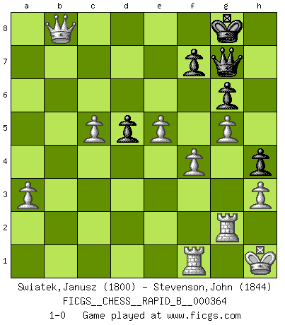 Last move : 1-0 2021 September 27 23:30:44 [Event "FICGS__CHESS__RAPID_B__000364"] [Site "FICGS"] [Date "2021.06.21"] [Round "1"] [White "Swiatek,Janusz"] [Black "Stevenson,John"] [Result "1-0"] [WhiteElo "1800"] [BlackElo "1844"] 1.e4 e5 2.Nf3 Nc6 3.Bb5 a6 4.Ba4 Nf6 5.O-O Nxe4 6.d4 b5 7.Bb3 d5 8.dxe5 Be6 9.c3 Bc5 10.Qd3 O-O 11.Be3 Qe7 12.Nbd2 Nxd2 13.Bxd2 Na5 14.Bc2 g6 15.Bg5 Qd7 16.b4 Bf5 17.Qd1 Nb7 18.Bxf5 Qxf5 19.bxc5 Qe6 20.Be3 Rfe8 21.Re1 Nd8 22.h3 Rb8 23.a3 a5 24.Bg5 Qc6 25.Bxd8 Rbxd8 26.Qd4 Re7 27.Re3 Qe8 28.Rae1 Qf8 29.Nh2 Qg7 30.Ng4 Kh8 31.Nh2 c6 32.Ng4 a4 33.f4 Re6 34.R3e2 Rf8 35.Re3 Rd8 36.Nh2 Rg8 37.R3e2 Qf8 38.Nf3 Qg7 39.g4 b4 40.cxb4 h6 41.Kh1 Kh7 42.g5 h5 43.Qd3 Kh8 44.Nd4 h4 45.Rg2 Rge8 46.Nf3 Kg8 47.Nh2 Qh7 48.Ng4 Qg7 49.Rf1 Kf8 50.Qd4 Qh7 51.b5 Rd8 52.b6 Qg8 53.Nf6 Qg7 54.Qxa4 Re7 55.Qxc6 Re6 56.Qc7 R6e8 57.Nxe8 Rxe8 58.b7 Kg8 59.b8Q Rxb8 60.Qxb8+ 1-0 Ruy Lopez : Open, 7.Bb3 Kingside Castling by player White (move 5) Kingside Castling by player Black (move 10) Promotion Queen by player White (move 59) Player White won this chess game. Follow this game move after move (download)The game of Chess is not merely an idle amusement; several very valuable qualities of the mind are to be acquired and strengthened by it, so as to become habits ready on all occasions; for life is a kind of Chess. (Benjamin Franklin) Besser ein falscher Plan, logisch durchgeführt, als gar kein Plan. (Viktor Kortschnoi) La partida mas dura de ganar es una partida ganada. (Emanuel Lasker) Il (Jacob Murray) ne joue pas pour le bon coup, mais pour le meilleur. (Eloi Relange) I just play for fun. (Anna Kournikova)