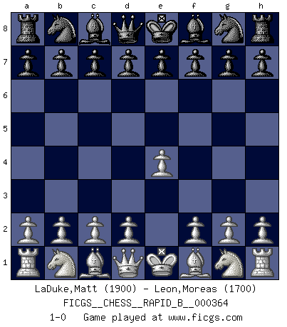 Last move : 1-0 2021 July 22 0:3:9 [Event "FICGS__CHESS__RAPID_B__000364"] [Site "FICGS"] [Date "2021.06.21"] [Round "1"] [White "LaDuke,Matt"] [Black "Leon,Moreas"] [Result "1-0"] [WhiteElo "1900"] [BlackElo "1700"] 1.e4 1-0 This chess game has been lost on time (started : 2021.06.21 16:0:52) King's pawn Opening Player White won this chess game. Follow this game move after move (download)Chess is life. (Bobby Fischer) Immer nach dem besten Zug zu suchen ist ziemlich unpraktisch. (Nigel Short) El Ajedrez tiene tanto misterio como las mujeres. (Purdy) Si rien de grave n'est détecté lors de l'analyse d'une position, on joue alors le coup. Seconde règle de Blumenfeld. I've never seen so many men wasted so badly. (Blondie in The Good, The Bad and The Ugly)