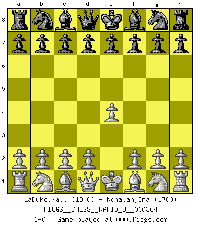 Last move : 1-0 2021 July 22 0:3:9 [Event "FICGS__CHESS__RAPID_B__000364"] [Site "FICGS"] [Date "2021.06.21"] [Round "1"] [White "LaDuke,Matt"] [Black "Nchatan,Era"] [Result "1-0"] [WhiteElo "1900"] [BlackElo "1700"] 1.e4 1-0 This chess game has been lost on time (started : 2021.06.21 16:0:52) King's pawn Opening Player White won this chess game. Follow this game move after move (download)All I want to do, ever, is just play Chess. (Bobby Fischer) Ein typischer, sehr verbreiteter Gedankenschädling ist der, daß der betreffende Amateur von der Annanhme ausgeht, daß jeder einzelne Zug etwas zu leisten habe. (Aaron Nimzowitsch) Cuando tu casa esta en llamas, no puedes ser molestado por tus vecinos. O, como decinos en Ajedrez, si tu Rey esta bajo ataque, no te preocupa perder un Peón del lado de la Reina. (Gary Kasparov) J'ai vu le vaincu d'Echecs jouer des années durant dans l'espoir de la fête de la victoire. Car tu es plus riche de ce qu'elle existe si même elle n'est point pour toi. Ainsi de la perle du fond des mers. (Antoine de Saint-Exupéry) The real danger is not that computers will begin to think like men, but that men will begin to think like computers. (Sydney J. Harris)