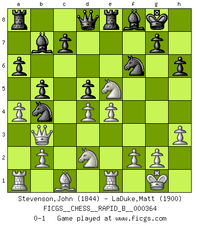 Last move : 0-1 2021 August 13 2:39:31 [Event "FICGS__CHESS__RAPID_B__000364"] [Site "FICGS"] [Date "2021.06.21"] [Round "1"] [White "Stevenson,John"] [Black "LaDuke,Matt"] [Result "0-1"] [WhiteElo "1844"] [BlackElo "1900"] 1.e4 e5 2.Nf3 Nc6 3.Bb5 a6 4.Ba4 Nf6 5.O-O Be7 6.Re1 b5 7.Bb3 O-O 8.c3 d6 9.h3 Bb7 10.d4 Re8 11.Nbd2 Bf8 12.a4 exd4 13.cxd4 h6 14.Qc2 Nb4 15.Bxf7+ Kxf7 16.Qb3+ d5 17.Ne5+ Kg8 0-1 This chess game has been lost on time (started : 2021.06.21 16:0:52) Ruy Lopez : Closed, 7...O-O Kingside Castling by player White (move 5) Kingside Castling by player Black (move 7) Player Black won this chess game. Follow this game move after move (download)Many Chess players were surprised when after the game, Fischer quietly explained: 'I had already analyzed this possibility' in a position which I thought was not possible to foresee from the opening. (Mikhail Tal) Wie kann ich Remis annehmen? Ich weiß ja gar nicht, wie ich stehe! (Fritz Sämisch) Yo creo que el Ajedrez posee una magia que es también una ayuda en la edad avanzada. Una rodilla reumática es olvidada durante una partida de Ajedrez y otros eventos pueden parecer algo sin importancia comparada a una catástrofe en el tablero de Ajedrez. (Vlastimil Hort) Le joueur d'Echecs qui veut atteindre le top est obligé de développer son propre credo créatif. Alexeï Stepanovicth Souétine. Il est facile d'écrire des livres ! Ce qui est difficile, c'est de jouer ! (Alexeï Stepanovicth Souétine) A government big enough to give you everything you want is strong enough to take everything you have. (Thomas Jefferson)