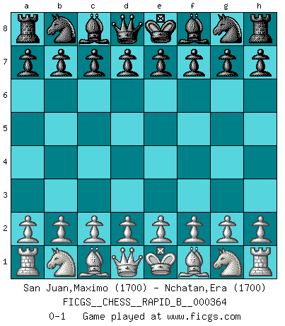 Last move : 0-1 2021 July 22 0:3:9 [Event "FICGS__CHESS__RAPID_B__000364"] [Site "FICGS"] [Date "2021.06.21"] [Round "1"] [White "San Juan,Maximo"] [Black "Nchatan,Era"] [Result "0-1"] [WhiteElo "1700"] [BlackElo "1700"] 0-1 This chess game has been lost on time (started : 2021.06.21 16:0:52) Player Black won this chess game. Follow this game move after move (download)Some sacrifices are sound; the rest are mine. (Mikhail Tal) Ein unbeabsichtigtes Patt ist der Gipfel der Dummheit. (Anonymous) Un buen jugador siempre tiene buena suerte. (José Raúl Capablanca) Les ravages du H expliquent la différence de niveau entre Tal et Thal [Abergel]. All art requires courage. (Anne Tucker)