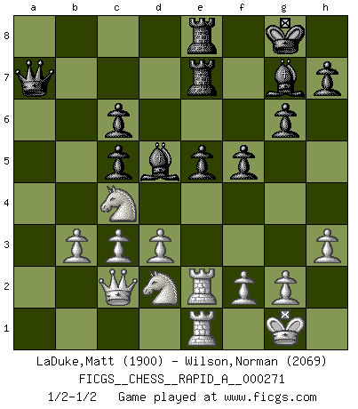Last move : 1/2-1/2 2021 July 29 5:4:0 [Event "FICGS__CHESS__RAPID_A__000271"] [Site "FICGS"] [Date "2021.06.22"] [Round "1"] [White "LaDuke,Matt"] [Black "Wilson,Norman"] [Result "1/2-1/2"] [WhiteElo "1900"] [BlackElo "2069"] 1.e4 c5 2.Nf3 Nc6 3.Bb5 g6 4.O-O Bg7 5.Bxc6 bxc6 6.Re1 Qc7 7.c3 d6 8.d3 Nf6 9.e5 dxe5 10.Nxe5 Nd5 11.Nc4 Bf5 12.Be3 Nxe3 13.Nxe3 Be6 14.Nd2 O-O 15.Qc2 Rfd8 16.Rad1 a5 17.Nec4 Bd5 18.b3 e5 19.Re2 Re8 20.Ne4 Qa7 21.Ned2 a4 22.Rde1 axb3 23.axb3 Re6 24.h3 Rae8 25.Ne4 f5 26.Ncd2 R6e7 27.Nd6 Ra8 28.N6c4 Rae8 1/2-1/2 Sicilian : Nimzovich-Rossolimo attack (with ...g6, without ...d6) Kingside Castling by player White (move 4) Kingside Castling by player Black (move 14) This chess game ended in a draw. Follow this game move after move (download)The King is a fighting piece. Use it ! (Wilhelm Steinitz) Kombinieren und Schwarzhandel gehören verboten. (Savielly Grigorievitsch Tartakower) ¡Examina movidas que hagan daño! Un buen ojo for movidas desvastantes es mucho mas importante que el conocimiento de principios estratégicos. (Purdy) Le profane ne songe pas à la somme de jouissance dont il se prive, qui méconnaît ce jeu aux ressources aussi variées que passionnantes. (Jean-Marie Jeanton-Lamarche) A bird doesn't sing because it has an answer, it sings because it has a song. (Maya Angelou)