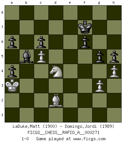 Last move : 1-0 2021 October 29 7:46:8 [Event "FICGS__CHESS__RAPID_A__000271"] [Site "FICGS"] [Date "2021.06.22"] [Round "1"] [White "LaDuke,Matt"] [Black "Domingo,Jordi"] [Result "1-0"] [WhiteElo "1900"] [BlackElo "1989"] 1.e4 e5 2.Nf3 d6 3.d4 exd4 4.Nxd4 Nf6 5.Nc3 Be7 6.Bf4 O-O 7.Qd2 d5 8.Ndb5 Bb4 9.O-O-O c6 10.Nc7 Nxe4 11.Qd4 Bxc3 12.bxc3 Qe7 13.c4 Qa3+ 14.Qb2 Qa5 15.cxd5 Nxf2 16.Be2 Na6 17.Nxa8 Nxh1 18.Rxh1 Nb4 19.Bc4 Qc5 20.Bd2 Nxd5 21.Bxd5 Qxd5 22.Re1 Rd8 23.Qc3 Qxa2 24.Re5 f6 25.Qa5 Qxa5 26.Rxa5 a6 27.Nb6 Be6 28.Ra3 Kf7 29.g3 h5 30.Be3 Re8 31.Na4 Bc8 32.Nb2 Re4 33.h4 Be6 34.Na4 Rg4 35.Bf2 Rb4 36.Nc5 Bc8 37.c3 Rb5 38.Ne4 Ke6 39.Bc5 b6 40.Bf8 Kf7 41.Bb4 Ke6 42.Bf8 Kf7 43.Bd6 Bf5 44.c4 Ra5 45.Rxa5 bxa5 46.Nd2 Ke6 47.Bf8 g5 48.Nb3 Kf7 49.Bd6 a4 50.Nd4 Bd3 51.c5 Bb5 52.Kb2 Kg6 53.Bc7 Kf7 54.Ba5 Kg6 55.Ka3 Kf7 56.Bd2 1-0 This chess game has been lost on time (started : 2021.06.22 16:36:18) Philidor : Exchange variation Kingside Castling by player Black (move 6) Queenside Castling by player White (move 9) Player White won this chess game. Follow this game move after move (download)Nonsense was the last thing Fischer was interested in, as far as Chess was concerned. (Elie Agur) Alles was am Schachbrett zählt sind gute Züge. (Robert James Fischer) Un juego de Ajedrez es un dialogo, una conversación entre un jugador y su oponente. Cada movimiento del oponente puede contener amenazas o tropiezos, pero un jugador no se puede defender de las amenazas o tomar ventaja de los tropiezos si es que no se pregunta a sí mismo: ¿Que es lo que mi oponente va a hacer después de cada movida?. (Bruce A. Moon) Les Echecs sont et restent toujours un combat, un combat intégral comme la boxe, la lutte ou un autre sport, et où il doit y avoir un vainqueur et un vaincu. (Joseph Emil Diemer) Depression is just anger without enthusiasm. (Unknown)