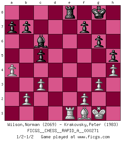 Last move : 1/2-1/2 2021 August 20 9:35:16 [Event "FICGS__CHESS__RAPID_A__000271"] [Site "FICGS"] [Date "2021.06.22"] [Round "1"] [White "Wilson,Norman"] [Black "Krakovsky,Peter"] [Result "1/2-1/2"] [WhiteElo "2069"] [BlackElo "1983"] 1.e4 c5 2.Nc3 d6 3.Nge2 Nf6 4.g3 Nc6 5.Bg2 g6 6.d4 cxd4 7.Nxd4 Nxd4 8.Qxd4 Bg7 9.O-O O-O 10.a4 Be6 11.Qd1 Rb8 12.Re1 Re8 13.Nd5 Nxd5 14.exd5 Bd7 15.Bf1 Qa5 16.Ra3 h5 17.c3 e6 18.dxe6 Rxe6 19.Rxe6 Bxe6 20.h4 Re8 21.Be3 Bf5 22.Ra1 Qc7 23.Qd2 Be4 24.Bd4 Bxd4 25.Qxd4 Qc5 26.Qxc5 dxc5 27.Re1 Bc6 1/2-1/2 Sicilian : Closed Kingside Castling by player White (move 9) Kingside Castling by player Black (move 9) This chess game ended in a draw. Follow this game move after move (download)I feel as if I were a piece in a game of Chess, when my opponent says of it: That piece cannot be moved. (Soren Kierkegaard) Viele Opfer benötigen überhaupt keine konkrete Berechnung. Es genügt sich die entstehende Position kurz vorzustellen, um uns davon zu überzeugen, dass das Opfer korrekt ist. (Mikhail Nekhemyevich Tal) El Ajedrez es un juego de pelea el cual es puramente intelectual e incluye la suerte. (Richard Reti) À la honte des hommes, on sait que les lois du jeu sont les seules qui soient partout justes, claires, inviolables et exécutées. Pourquoi l'Indien qui a donné les règles du jeu d'échecs est-il obéi de bon gré dans toute la terre, et que les décrétales des papes, par exemple, sont aujourd'hui un objet d'horreur et de mépris ? C'est que l'inventeur des échecs combina tout avec justesse pour la satisfaction des joueurs, et que les papes, dans leurs décrétales, n'eurent en vue que leur seul avantage. L'Indien voulut exercer également l'esprit des hommes et leur donner du plaisir; les papes ont voulu abrutir l'esprit des hommes. Voltaire (Dictionnaire philosophique / Garnier 1967) You think that education is too expensive ? Try ignorance. (Derek Bok)