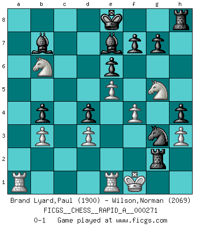 Last move : 0-1 2021 July 8 11:8:43 [Event "FICGS__CHESS__RAPID_A__000271"] [Site "FICGS"] [Date "2021.06.22"] [Round "1"] [White "Brand Lyard,Paul"] [Black "Wilson,Norman"] [Result "0-1"] [WhiteElo "1900"] [BlackElo "2069"] 1.e4 c5 2.f4 d5 3.e5 Nc6 4.Bb5 Qb6 5.Bxc6+ Qxc6 6.Nf3 h5 7.d3 Nh6 8.O-O Nf5 9.Nc3 e6 10.a4 b6 11.Nb5 Bb7 12.Re1 Be7 13.b3 a6 14.Nc3 h4 15.h3 Rc8 16.Ba3 b5 17.axb5 axb5 18.Qd2 b4 19.Bxb4 cxb4 20.Na4 d4 21.Ng5 Qxc2 22.Qxc2 Rxc2 23.Nb6 Rxg2+ 24.Kf1 Ng3+ 0-1 Sicilian : Grand Prix attack Kingside Castling by player White (move 8) Player Black won this chess game. Follow this game move after move (download)You sit at the board and suddenly your heart leaps. Your hand trembles to pick up the piece and move it. But what Chess teaches you is that you must sit there calmly and think about whether it's really a good idea and whether there are other better ideas. (Stanley Kubrick) Karpov ist ein Museumsstück. (Garry Kasparov) Cuando me preguntan: -¿Cual es el secreto que te hace hacer mejores movidas que tus oponentes?, Yo respondo: Me da gusto que me pregunten eso, porque, como veran, hay una simple razón. Yo pienso mis propias movidas y dejo a mi oponente que el piense las suyas. (Alexander Alekhine) Les sacrifices démontrent seulement que quelqu'un a gaffé. (Savielly Tartacover) There's no money in correspondence chess. (John Knudsen)