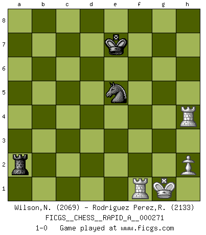 Last move : 1-0 2021 October 8 0:11:59 [Event "FICGS__CHESS__RAPID_A__000271"] [Site "FICGS"] [Date "2021.06.22"] [Round "1"] [White "Wilson,Norman"] [Black "Rodriguez Perez,Rene"] [Result "1-0"] [WhiteElo "2069"] [BlackElo "2133"] 1.e4 e6 2.Nc3 d5 3.d4 Nf6 4.e5 Nfd7 5.f4 a6 6.Nce2 c5 7.c3 Be7 8.Nf3 O-O 9.g4 Nc6 10.Bg2 a5 11.O-O a4 12.f5 Nb6 13.Ng3 cxd4 14.cxd4 f6 15.Bf4 Nc4 16.Kh1 fxe5 17.dxe5 Qb6 18.g5 Nxb2 19.Qe2 exf5 20.Nh5 Be6 21.Nf6+ Kh8 22.g6 gxf6 23.Rab1 a3 24.Nh4 Nxe5 25.Qh5 Rf7 26.gxf7 Bxf7 27.Qxf5 Ng6 28.Qh3 Nxh4 29.Qxh4 Qb4 30.Rf3 Bg6 31.Rb3 Qd4 32.Rf1 Be4 33.Bg3 Qc4 34.Rg1 Bxg2+ 35.Rxg2 Qf1+ 36.Rg1 Qf5 37.Qd4 Nc4 38.Qd3 Qxd3 39.Rxd3 Rd8 40.Bh4 Ne5 41.Rxa3 d4 42.Ra7 Ng6 43.Rxb7 Nxh4 44.Rxe7 Nf5 45.Re2 h5 46.Rd2 Ra8 47.Ra1 Ra4 48.Rf2 Ne3 49.Rxf6 Kg7 50.Rc6 Kf7 51.Rb1 Ra7 52.Kg1 d3 53.Rd6 Nc4 54.Rf1+ Ke7 55.Rxd3 Rxa2 56.Rd5 h4 57.Rd4 Ne5 58.Rxh4 1-0 French defense Kingside Castling by player Black (move 8) Kingside Castling by player White (move 11) 10 pieces endgame at move 49 : White KRRPP , Black KRNPP WHITE : King + 2 Rooks 2 Pawns BLACK : King + 1 Rook 1 Knight 2 Pawns 9 pieces endgame at move 55 : White KRRPP , Black KRNP WHITE : King + 2 Rooks 2 Pawns BLACK : King + 1 Rook 1 Knight 1 Pawn 8 pieces endgame at move 55 : White KRRP , Black KRNP WHITE : King + 2 Rooks 1 Pawn BLACK : King + 1 Rook 1 Knight 1 Pawn 7 pieces endgame at move 58 : White KRRP , Black KRN WHITE : King + 2 Rooks 1 Pawn BLACK : King + 1 Rook 1 Knight Player White won this chess game. Follow this game move after move (download)The older I grow, the more I value pawns. (Paul Keres) Auf jeden Fall musst du zuerst Rechtsanwalt werden, damit du deine eigenen Interessen und die deiner Familie vertreten kannst. [Brief an seinen Sohn] (José Raúl Capablanca) El Ajedrez es imaginación. (David Bronstein) La victoire dans une partie d'Echecs appartient la plupart du temps à celui qui voit un peu plus loin que l'adversaire. (Lasker) There's always a bigger fish. (Qui-Gon Jinn in Star Wars ep.1)