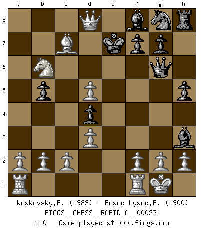 Last move : 1-0 2021 August 2 21:22:50 [Event "FICGS__CHESS__RAPID_A__000271"] [Site "FICGS"] [Date "2021.06.22"] [Round "1"] [White "Krakovsky,Peter"] [Black "Brand Lyard,Paul"] [Result "1-0"] [WhiteElo "1983"] [BlackElo "1900"] 1.e4 e5 2.Nf3 Nc6 3.Bb5 Qf6 4.Nc3 Nd4 5.Nxd4 exd4 6.Nd5 Qd6 7.d3 c6 8.Bf4 Qg6 9.Nc7+ Kd8 10.Nxa8 cxb5 11.O-O h5 12.Qd2 d5 13.Qa5+ b6 14.Qxa7 Qc6 15.Bc7+ Ke8 16.Nxb6 Bh3 17.exd5 Qg6 18.Qb8+ Ke7 19.Qd8+ 1-0 Ruy Lopez (Spanish Opening) Kingside Castling by player White (move 11) Player White won this chess game. Follow this game move after move (download)If you aren't afraid of Spassky, then I have removed the element of money. (Jim Slater) Im Reiche der Wirklichkeit ist man nie so glücklich wie im Reiche der Gedanken. (Arthur Schopenhauer) Siempre es mejor sacrificar los hombres de tu oponente. (Savielly Tartakower) Je menace de comprendre la position. (Anonyme) There is no instance of a country having benefited from prolonged warfare. (Sun Tzu)