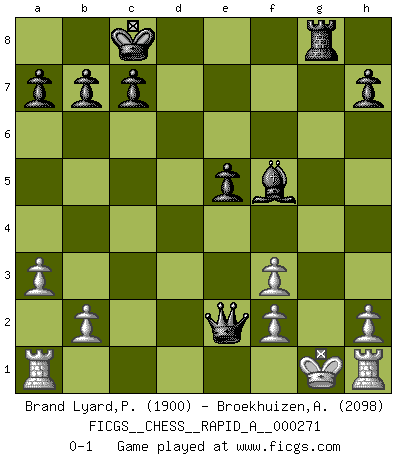 Last move : 0-1 2021 June 30 20:36:10 [Event "FICGS__CHESS__RAPID_A__000271"] [Site "FICGS"] [Date "2021.06.22"] [Round "1"] [White "Brand Lyard,Paul"] [Black "Broekhuizen,A. T. S."] [Result "0-1"] [WhiteElo "1900"] [BlackElo "2098"] 1.e4 e5 2.Bc4 Nf6 3.Nc3 Nxe4 4.Nxe4 d5 5.Bxd5 Qxd5 6.d3 Nc6 7.c4 Bb4+ 8.Bd2 Qxd3 9.a3 Qxe4+ 10.Kf1 Qxc4+ 11.Ne2 Bxd2 12.Qxd2 Bf5 13.Qg5 Nd4 14.Qxg7 Qxe2+ 15.Kg1 O-O-O 16.Qxf7 Nf3+ 17.gxf3 Rhg8+ 18.Qxg8 Rxg8+ 0-1 Bishop's Opening : Berlin defense Queenside Castling by player Black (move 15) Player Black won this chess game. Follow this game move after move (download)The most powerful weapon in Chess is to have the next move. (David Bronstein) Ich organisiere ein großes Turnier, was mich etwa 120000 Dollar kostet. Ich denke, das ist das erste Mal in der Schachgeschichte, daß ein Schachgroßmeister auch als Mäzen auftritt. (Miguel Najdorf) Una compensación adecuada por un sacrificio es tener una combinación sólida que conduce a una posición ganadora; una compensación adecuada por una metida de pata es dejar a tu oponente arrebatar una derrota de las fauces de la victoria. (Bruce A. Moon) Même si vous avez un bon coup à faire, regardez toujours s'il n'y en a pas un qui lui soit préférable. (Pedro Damiano) . 'gn is not allowed in chess unless n is an integer between 1 and 8 inclusive, where 1 and 8 are to interpreted as the standard numerals standing for integers in the ordered real-closed field R, with the *canonical* ordering. (As opposed to, say, an integer in the domain Z[2+i*sqrt(5)] or an integer in some exotic Grothendieck topos). (Normajean Yates)