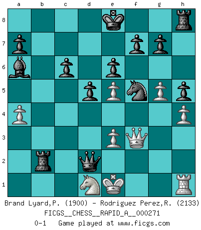 Last move : 0-1 2021 July 24 23:25:24 [Event "FICGS__CHESS__RAPID_A__000271"] [Site "FICGS"] [Date "2021.06.22"] [Round "1"] [White "Brand Lyard,Paul"] [Black "Rodriguez Perez,Rene"] [Result "0-1"] [WhiteElo "1900"] [BlackElo "2133"] 1.e4 e6 2.d4 d5 3.e5 c5 4.dxc5 Nc6 5.Bb5 Bxc5 6.Bxc6+ bxc6 7.Be3 Bxe3 8.fxe3 Qh4+ 9.g3 Qe4 10.Qf3 Qxc2 11.Na3 Qxb2 12.Rd1 Qxa3 13.Rd2 Ne7 14.g4 Rb8 15.h4 h5 16.g5 Nf5 17.Nh3 Qc3 18.a4 Ba6 19.Nf2 Rb2 20.Nd1 Qxd2+ 0-1 French : Advance, Steinitz variation Player Black won this chess game. Follow this game move after move (download)First-class players lose to second class players because second-class players sometimes play a first-class game. (Tarrasch) Wenn man heute mit 14 Jahren noch kein GM ist, kann man es vergessen. (Viswanathan Anand) Por esta medida (el intervalo entre Fischer y sus contemporaneos), yo le considero el mas grande campeón mundial. (Garry Kasparov) Les ravages du H expliquent la différence de niveau entre Tal et Thal [Abergel]. The difference between perseverance and obstinacy is that one comes from a strong will, and the other from a strong won't. (Henry Ward Beecher)